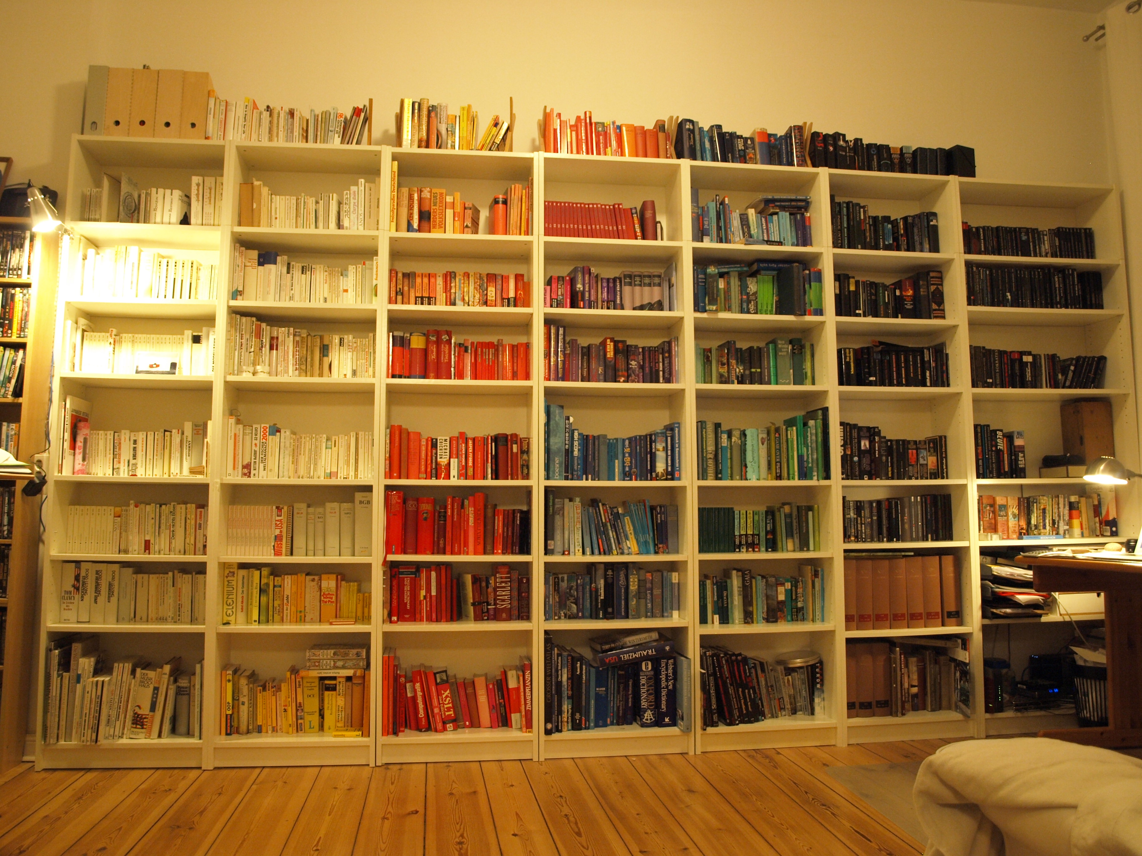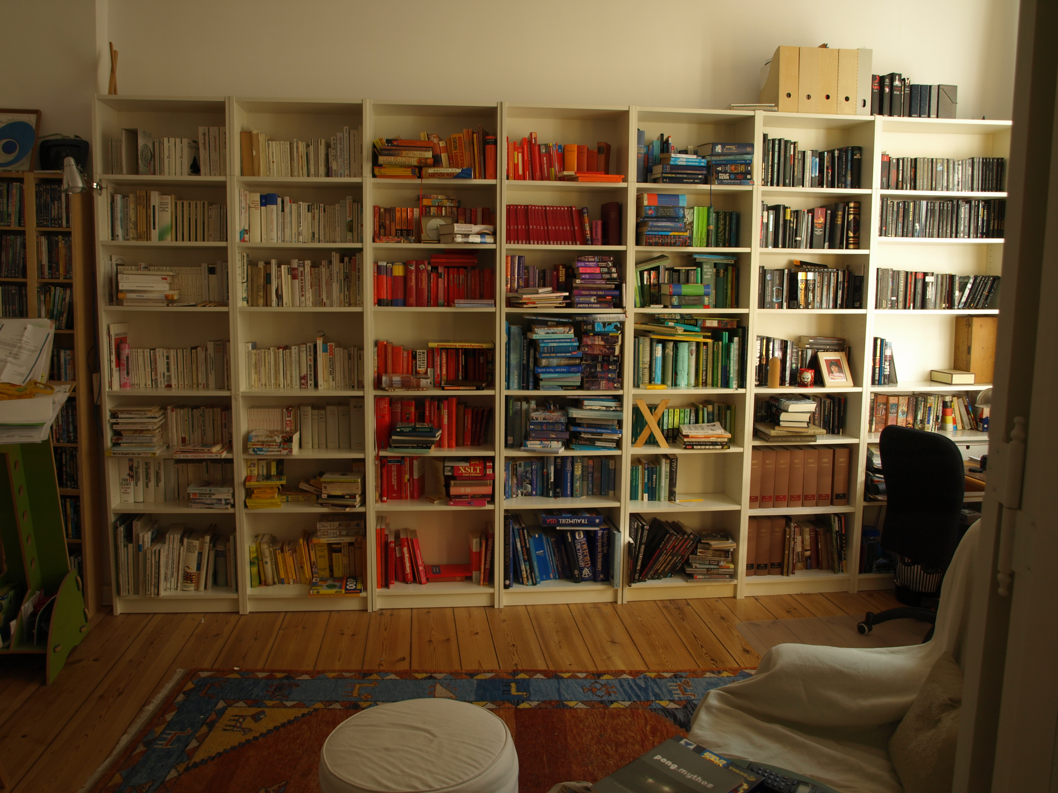 Genauso absonderlich fand ich eine Methode, für die es einige Beispiel auf Bookshelf Porn und ähnlichen Seiten zu bewundern gibt: Bücherregale, deren Inhalt nach Farben sortiert ist. Nach Farbe?