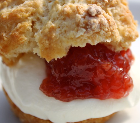 Dazu dann eine Jam – eigentlich eine selbstgemachte Erdbeer-Marmelade von meiner Tante, die ab heute nur noch „Königliche Marmelade“ genannt wird. Und Clotted Cream – auch geschummelt. Clotted Cream ist eigentlich eine Spezialität aus Devon und Cornwall, hier zwar zu kriegen, aber ich trau der Rohmilch im Zusammenhang mit dem Transport nicht wirklich. Also haben wir ganz unbritisch Mascarpone als Basis genommen und mit Sahne, Zucker und Zitrone verrührt. Schmeckt fast genauso, wie ich aus eigener Erfahrung sagen kann.