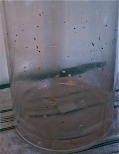 Einfach abwaschen? Hilft leider nicht. In den letzten zwei Wochen hat sich der Kalk- und Schmutzolm darin breitgemacht und so bleiben unschöne Ränder zurück. Da bleibt nur der Griff zu meiner kleinen Geheimwaffe, eine ausgemusterte Sprühflasche mit einer kräftigen Zitronensäurelösung. Zitronensäure gibt es übrigens preiswert in größeren Mengen in Kristallform beim türkischen Lebensmittelhändler. Also die Vase kräftig einsprühen, drei Minuten warten, nachwischen, ausspülen und abtrocknen und schon sieht sie so aus.