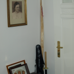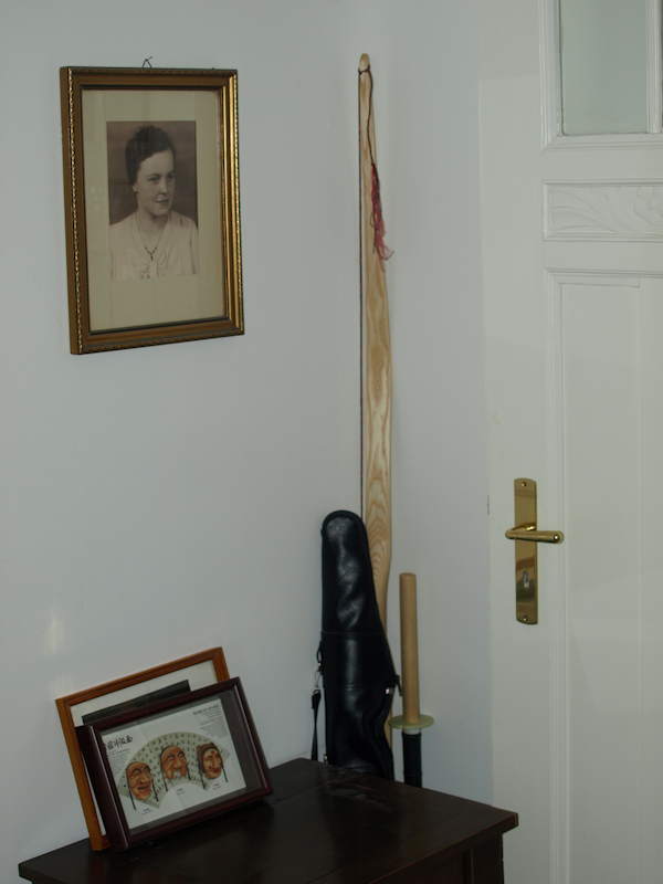 So steht das Schwert gut verpackt in der Ecke unter dem Bild der Oma. Einen Schwertständer habe ich nicht übers Herz gebracht, das wäre dann doch etwas dick aufgetragen.