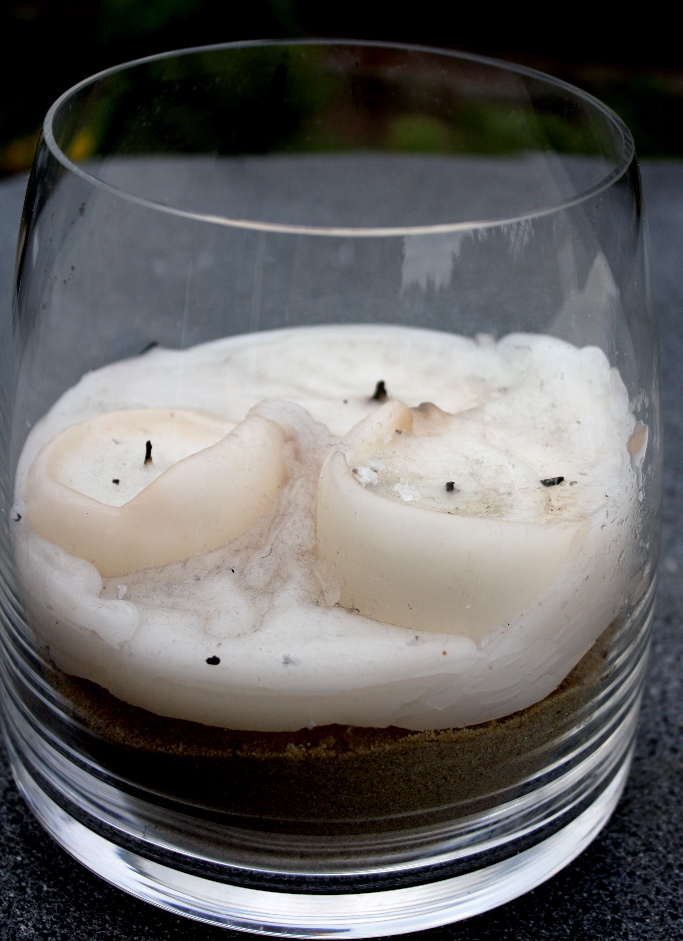 Das ist unsere 08/15 jeden Tag zu gebrauchende Draußenkerze. Und so sieht sie auch mittlerweile schon aus. Ursprünglich hatte ich mal eine breite Vase mit Sand gefüllt, dann drei mitteldicke Kerzen hineingesteckt und mit ein paar Muscheln dekoriert. DIe Muscheln sind mittlerweile in der Wachsschicht ertrunken und nicht mehr zu sehen und die Kerzen müssen jetzt so lange brennen, bis sich das Wachs so dezimiert hat, dass es sich genug in der Sonne erwärmt, damit ich es irgendwie aus dem Ding rausbekomme. Aber wenn es mal so auf dem dunklen Tisch scheint, ist das schon schön…
