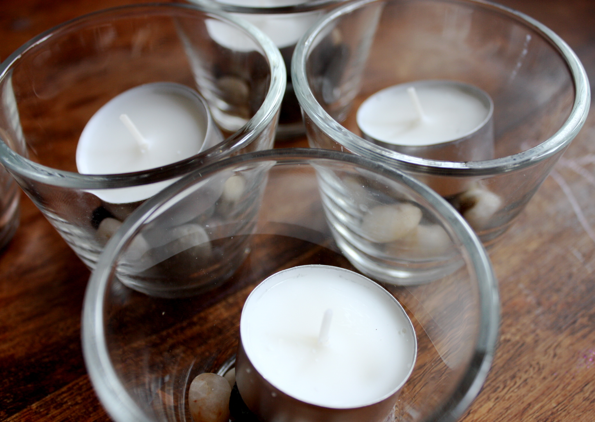 Da wären als erstes unsere universellen IKEA-Gläser. Im Winter stehen sie bei uns auf dem Kaminsims, im Sommer sind sie Allrounder für wahlweise unseren Tisch oder aber die Bistrostehtische sämtlicher Nachbarn und/oder Freunde. Am liebsten mag ich es, wenn kleine Naturkiesel drin sind, Teelicht drauf – fertig. Zu Feiern haben wir aber auch schon Goldsteinchen oder ganz weisse Kiesel eingefüllt.