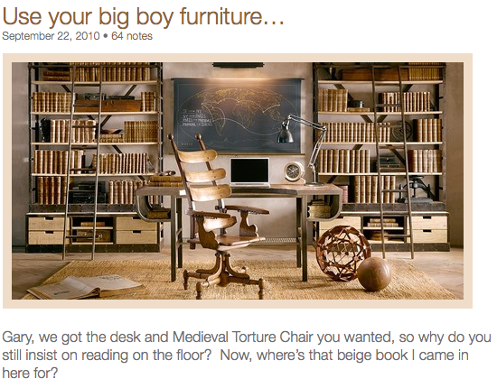 Zugegeben, ohne Englischkenntnisse kommt man bei Catalog Living nicht weit, aber wenn man sich ein wenig eingelesen hat, dann kommt man aus dem Lachen und dem Kopfschütteln ob der seltsamen Kapriolen von Bild-Stylisten und Designern nicht mehr raus.