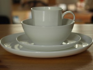 Wie viele unterschiedliche Teile braucht ein alltagstaugliches Porzellanservice? Und wieviel hat man zusätzlich noch im Schrank? So ein herkömmliches Kombiservice hat locker vier verschiedene Sorten Teller: den großen, den kleinen, den tiefen und die Untertasse. Dazu Tassen, Becher, Eierbecher, Zuckerdose und braucht man heute wirklich noch eine Kaffeekanne? Außerdem steht in der Vitrine ja auch noch das „gute“ Geschirr, in meinem Fall ein wirkliches Erbstück, das darüber hinaus auch noch mit einem Teeservice, Terrinen, Schüsseln, Platten aufwartet. Ist sowas nicht heutzutage obsolet?
