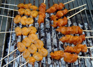 Es reicht ein Päckchen Saté-Gewürz aus dem Asiamarkt, das man mit Kokosmilch glatt rührt. Man kann da natürlich noch seine persönliche Note (mehr Chili, Curcuma, Zitronengras oder ähnliches) einbringen, das ist für den Anfänger aber überbewertet. Dann legt man Fleisch seiner Wahl, am besten Scampi oder Hähnchen, für 3-4 Stunden ein. Scampi kommen immer gut an, sind mit 7-9 € pro Kilo auch gar nicht so teuer und vermitteln immer noch den Hauch von Luxus. Man sollte nur nicht zu genau über die Herstellung Bescheid wissen, aber da kann man sich bei fast jedem Nahrungsmittel inzwischen den Appetit verderben.
