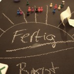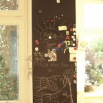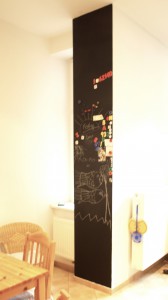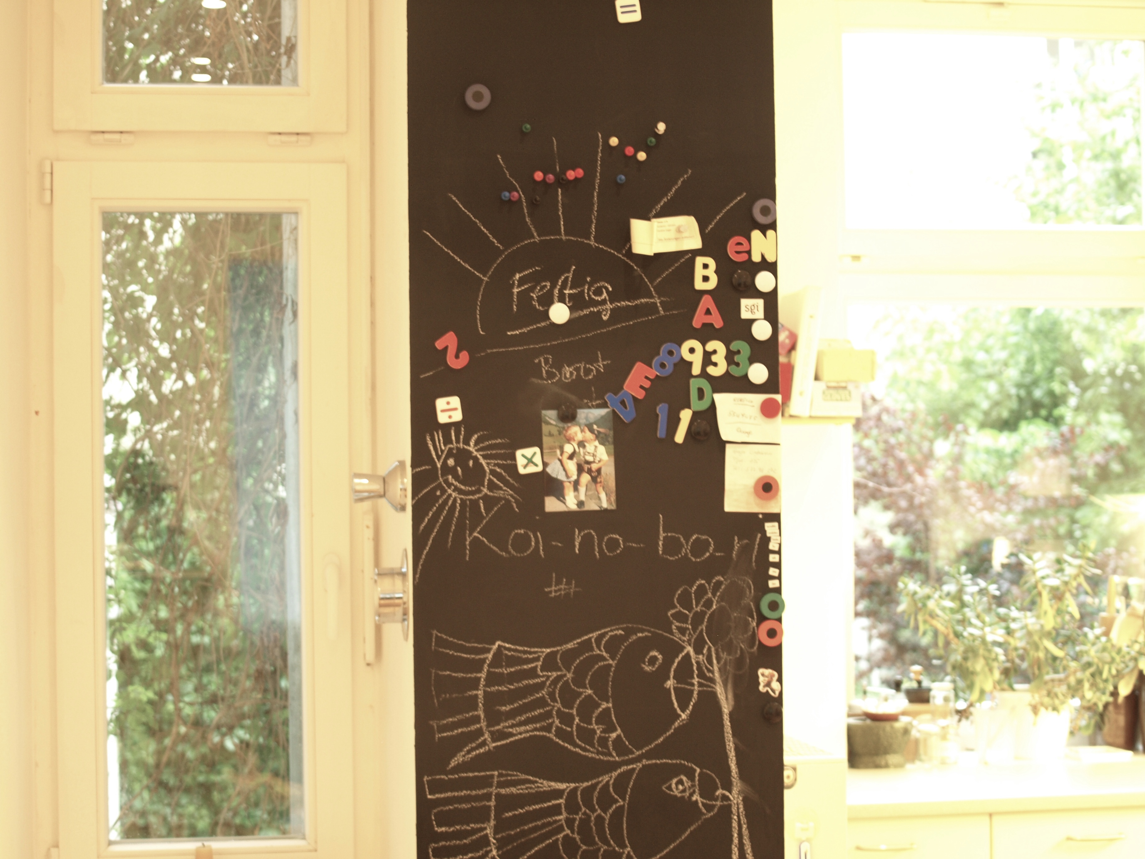 Es war dann doch eine Heidenarbeit. Statt, wie ich mir das so naiv dachte, einfach mal die Wand anzupinseln und am nächsten Tag eine Tafel zu haben, zog sich das Projekt über Wochen hin. Es wurden Experten zu Rate gezogen. Im Ergebnis erst tapeziert, und dann erst gestrichen. Alle Beteiligten waren sich einig, dass sie noch nie auch nur annähernd soviel Zeit für eine einzige Tapetenbahn benötigt hätten. Was wohl am verwendeten Material lag, denn wo eine normale Tapete ja durchaus Leim aufsaugt, soll dass beim Makulatur Vliess nicht passieren, weil sonst die Oberfläche nicht so glatt wird wie gewünscht. Dementsprechend oft muss der Leim ausgestrichen werden. Und das dauert. Dann hat der Tafellack nicht gereicht. Und irgendwie war die Oberfläche nach dem ersten lackieren rauer als vorher. Also wurde abgeschliffen. Gut, das der familieninterne Experte auch für solche Fälle ausgerüstet ist. Um dann noch mal zwei Schichten Tafellack zusätzlich aufzutragen. Aber jetzt ist es schön. Die Farbe deckt, ist schön satt schwarz. Kreide hält, Magnete auch und die halten ihrerseits sogar Papier. Interessanter Akzent in unserer hellen Küche.