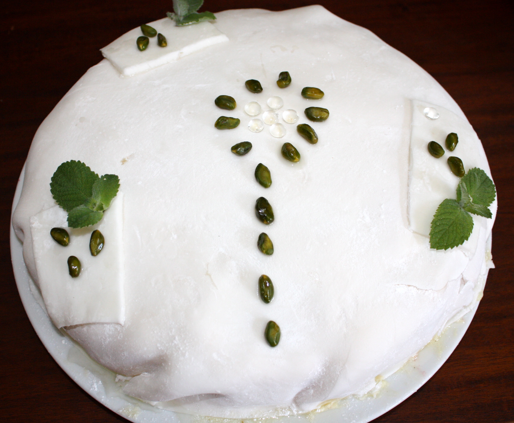 So, und dann kann man seinen Rollfondant selbst machen. Man kann aber auch einfach irgendwann seine Grenzen erkennen und das Zeug bestellen. Es kommt für gar nicht viel Geld sauber verpackt in handlichen Größen, zusammen mit anderem netten Dekorkrimskrams. Was nicht heißt, dass es keine Sauerrei ist, das Zeug auf Puderzucker zu kneten und auf die richtige Größe auszurollen. Hat man das geschafft ruft man jemand, der mindestens Handgröße 8 hat zur Hilfe, geht mit den Händen unter den Fondant, hebt auf drei die Zuckermasse hoch und senkt sie vorsichtig auf die vorher rausgeholte Torte. Wenn das geklappt hat, hat man quasi gewonnen.