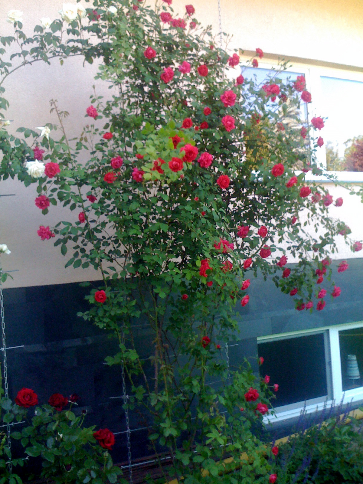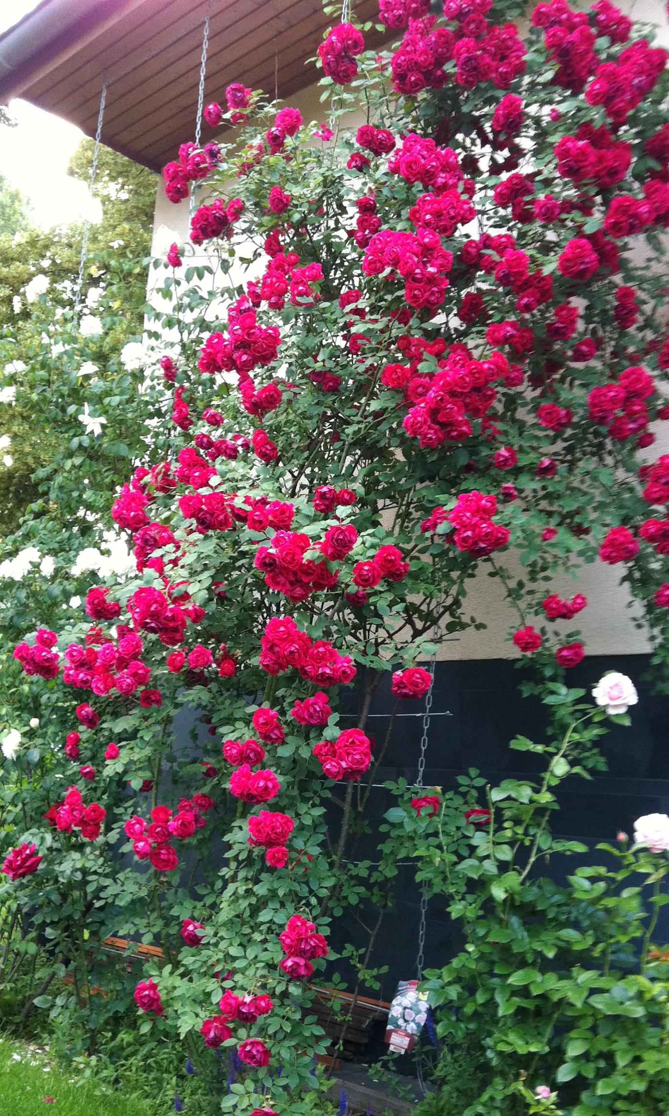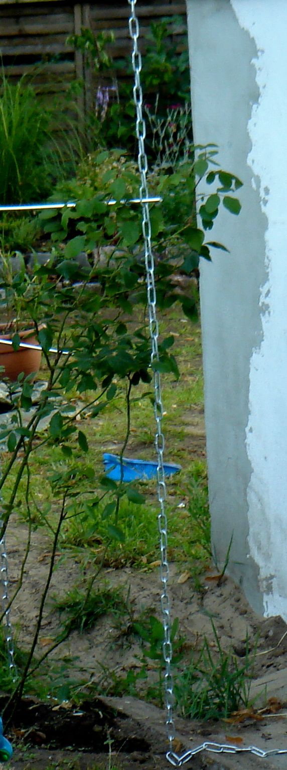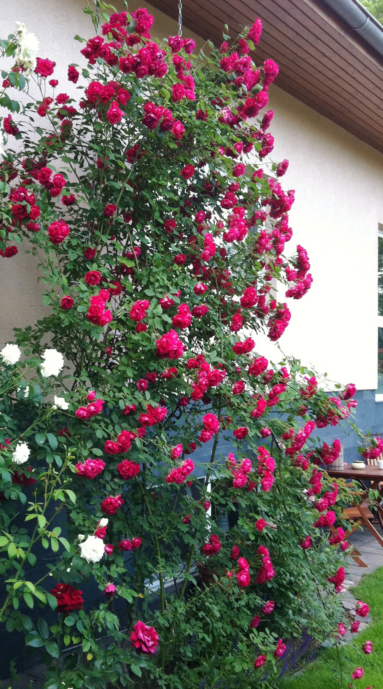 Fünf Monate später kam dann die zweite ungeplante Kletterrose dazu. Also gleiches Spiel noch mal: Kette und Gewindestangen kaufen. Das Ganze am Dachkasten montieren und Rose dazu pflanzen. Ein Jahr später sah das Ganze dann schon so aus.