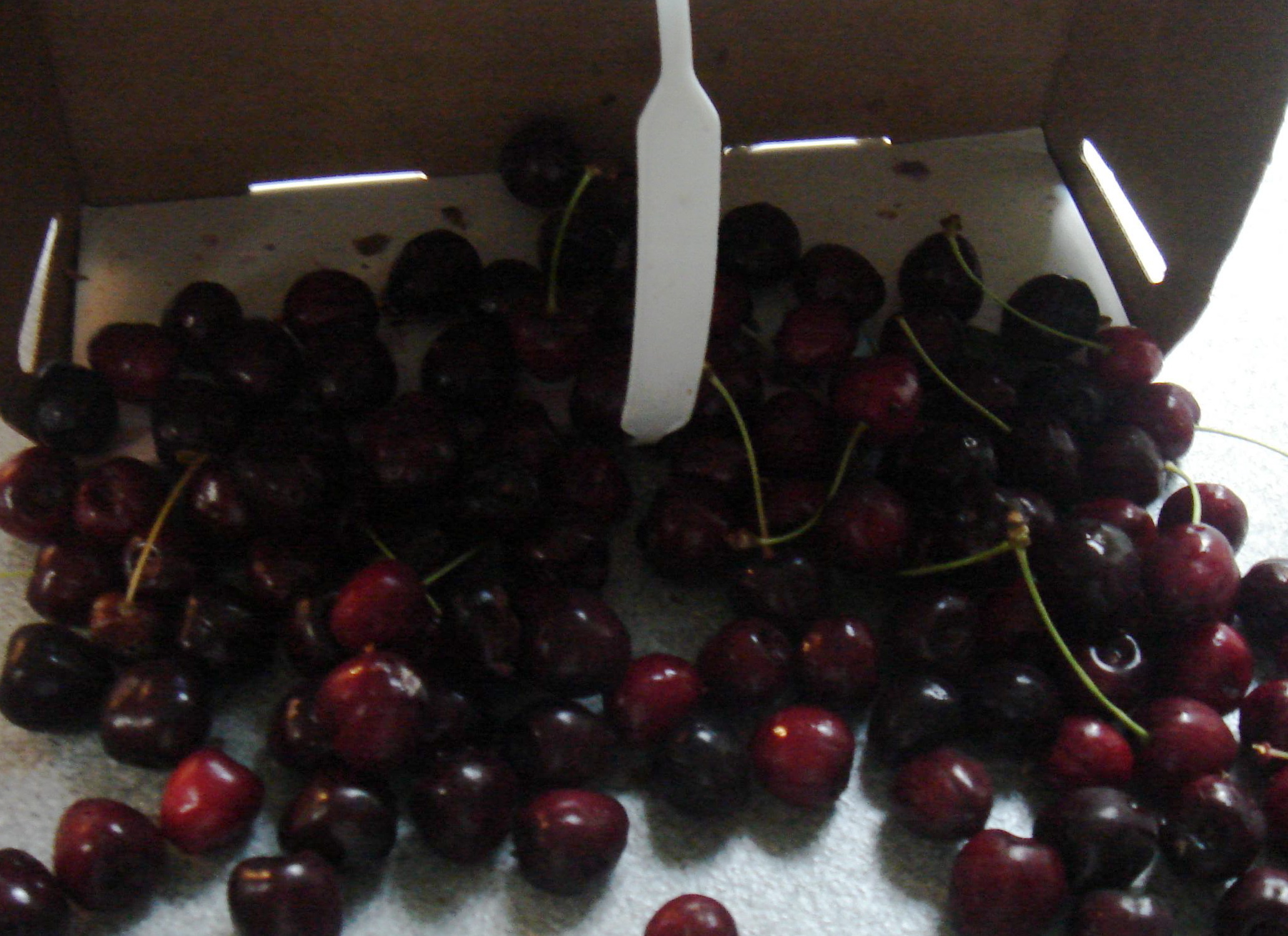 Der Kleine Mann war beim Kumpel, die gaben ihm dann auch noch einen Korb mit Kirschen auf den Weg. Ich durfte der Besten Blondine helfen, den Kirschbaum auf dem Nachbargrundstück abzuernten. Erdbeeren kamen auch noch ins Haus (weil sie gut aussahen) und Pflaumen , Bananen, Äpfel sind auch noch reichlich da. Wer soll das eigentlich alles essen, bevor es vergammelt? Naja, die Kirschen standen dann schon eine Weile in der Küche, waren auch nicht mehr so schön und beim Versuch des Entkernens tauchte das eine oder andere Tierchen auf.