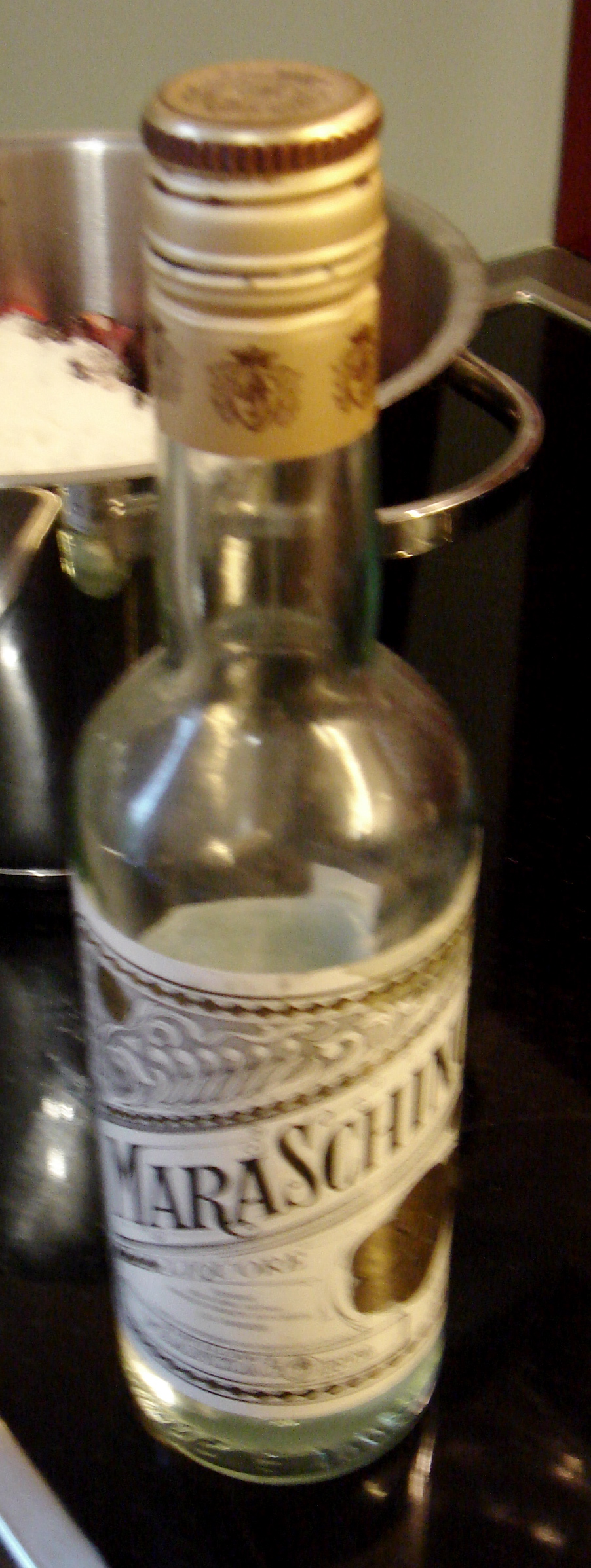 Da mir das zu langweilig war, kam nach einigem Stöbern im Barschrank noch der Maraschino hinzu, der schon vor Jahren mit uns zusammen umgezogen ist.