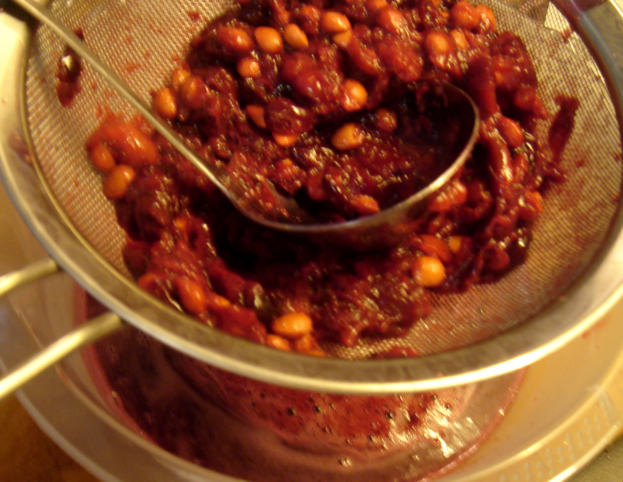 Das Ganze wurde dann durch ein feines Haarsieb gestrichen (es geht mit einer großen Kelle wirklich am besten). Der Stabmixer schied wegen der Kerne schon im Vorfeld aus.