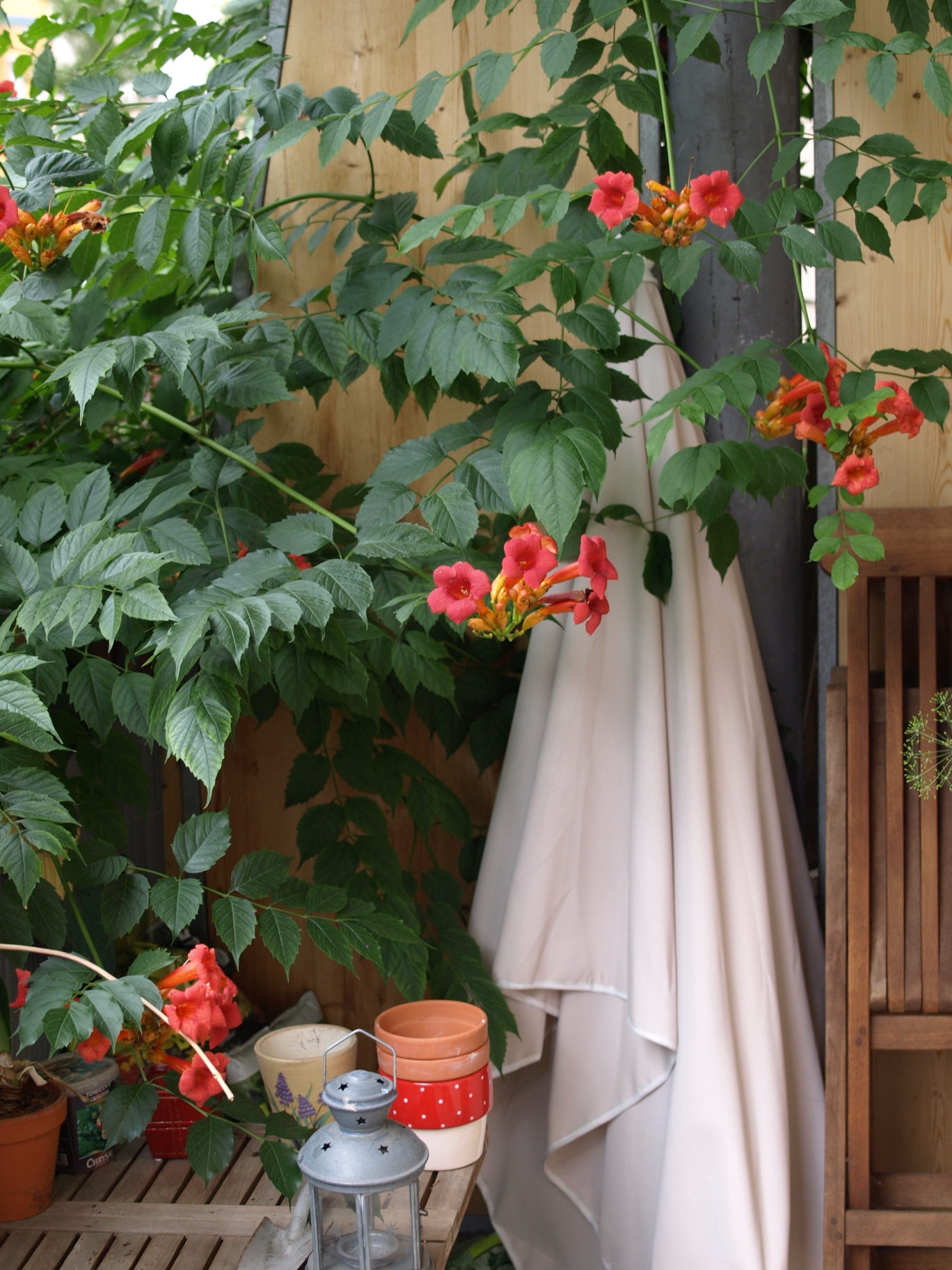 Irgendwie wird das nichts mit meinem Balkon, dieses Jahr. Eine Sorte Basilikum ist zwar gekommen, aber dass aus der ganzen Saatscheibe nur ein Stängel wächst, hatte ich mir so nicht vorgestellt. Die Balkontomaten stehen kräftig, hübsche Pflanzen eigentlich, blühen auch. Aber keine Tomate weit und breit. Einzig der Dill kam so, wie erhofft. Sehr lecker. Nur war der dann genau zu der Zeit erntereif, als mir der Appetit auf Gurken und grünen Salat, EHEC sei Dank, ziemlich vergangen war. Versöhnt hat mich dann der alljährliche Balkongast, der vom Nachbarn rüberwächst und uns mit Grün und Blüten überschüttet. Allerdings hab ich keine Ahnung, wie die Pflanze heisst.