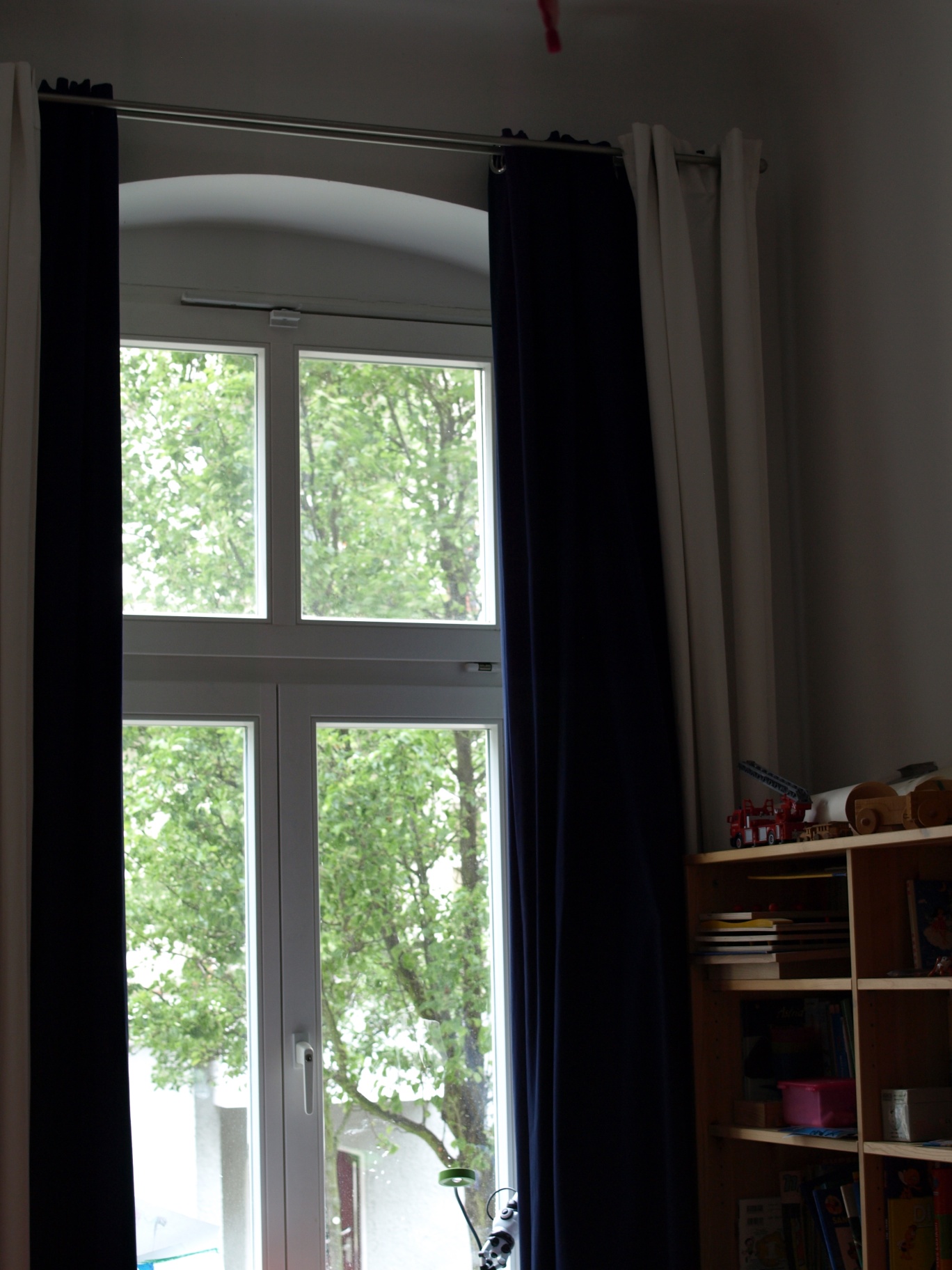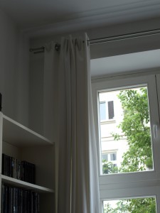 Jetzt heisst das nicht, das ich grundsätzlich für nackige Fenster bin. Ich hab durchaus Erfahrung mit Vorhängen, Jalousien und Rollos und weiss deren Vorzüge auch zu schätzen. Besonders, seitdem wir in die kleine Straße nach Berlin gezogen sind, in der man den Nachbarn gegenüber abends bei Licht ungehindert in die Wohnbung gucken kann, wenn die nicht zuziehen. Dafür haben wir Vorhänge. Als wir damals planten, waren diese gespannten Drahtseile als Aufhängevorrichtung sehr beliebt. Fand ich auch sehr schick. Allerdings war skeptisch, was die praktische Anwendung angeht, nachdem ich im Freundeskreis einige Exemplare gesehen hatte, die dauernd durchhingen. Wir haben uns dann für feste Gardinenstangen entschieden. Doppelte, man weiss ja nie. Dazu hatten wir uns ursprünglich Vorhänge mit verdeckten Schlaufen ausgesucht, in schlicht-grau. Das sah ziemlich gut aus, hatte nur den Nachteil, dass die Schlaufen auf den Stangen schlecht bis gar nicht rutschten. Das abendliche Zuziehen gestaltete sich schwierig. Auf die Dauer war uns das zu umständlich und wir haben die die geschlauften Dinger gegen solche mit Metallringen ausgetauscht. Die sind in den Wohnräumen weiss, dadurch kann man sie jetzt im Sommer gegen die blendende Sonne einsetzen, ohne gleich das Gefühl zu haben, in einer Höhle zu sitzen. In unserem Schlafzimmer etwas dunkler, und im Kinderzimmer hängen sie gleich doppelt, einmal in weiss und einmal in dunkelblau. Letztere hatten einen sehr positiven Einfluss auf das kindliche Schlafverhalten, denn die machen richtig dunkel.