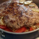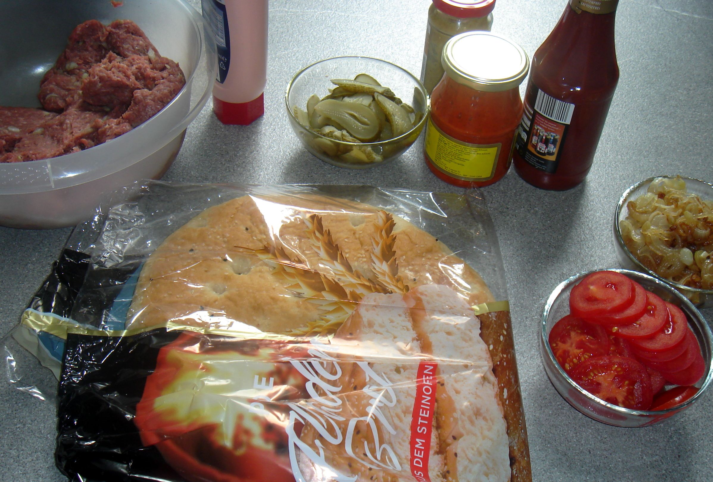 Vorweg dann noch einen kleinen Double Burger im Fladenbrot mit selbstgezogenen Tomaten. Das stapelt sich recht gut in der Springform, geht aber auch ohne.