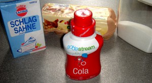 Cola-Eiscreme: Nehmt Euch euer Lieblings-Mousse-Rezept und fügt Cola-Sirup nach Geschmack hinzu, das funktioniert am besten. Ob Ihr das Eis danach in der Eismaschine macht oder als Parfait einfriert, ist egal. Der Zucker auf dem Bild ist übrigens nur Deko, dieser Sirup ist so schweinesüß, da braucht ihr keinen Zucker mehr. Am meisten irritierte mich, dass dieses Eis bei den Großen besser ankam als bei den kleinen Monstern.