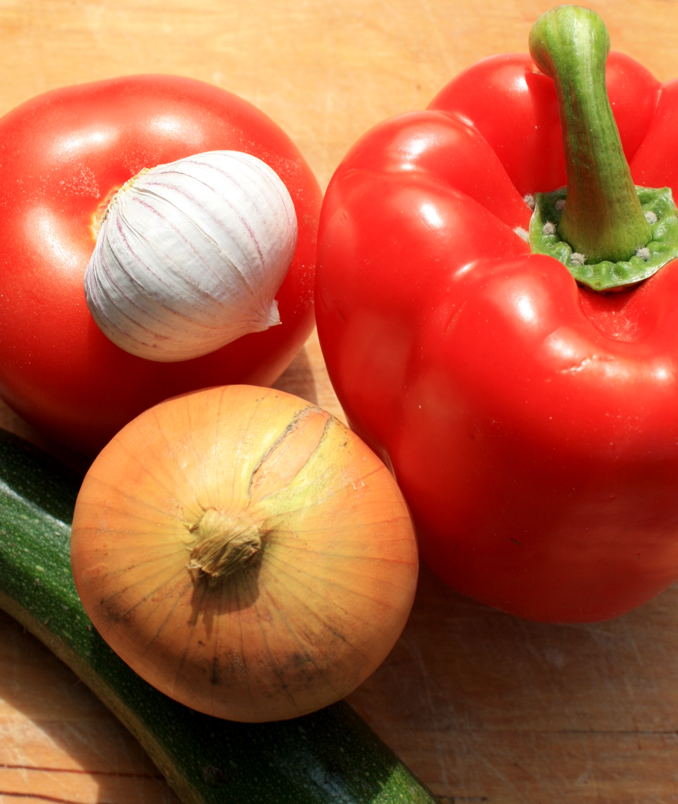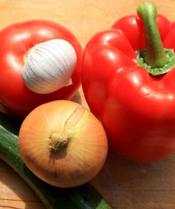 Tomaten überbrühen, schälen und entkernen Zucchini und Paprika entkernen, die Zwiebel schälen.