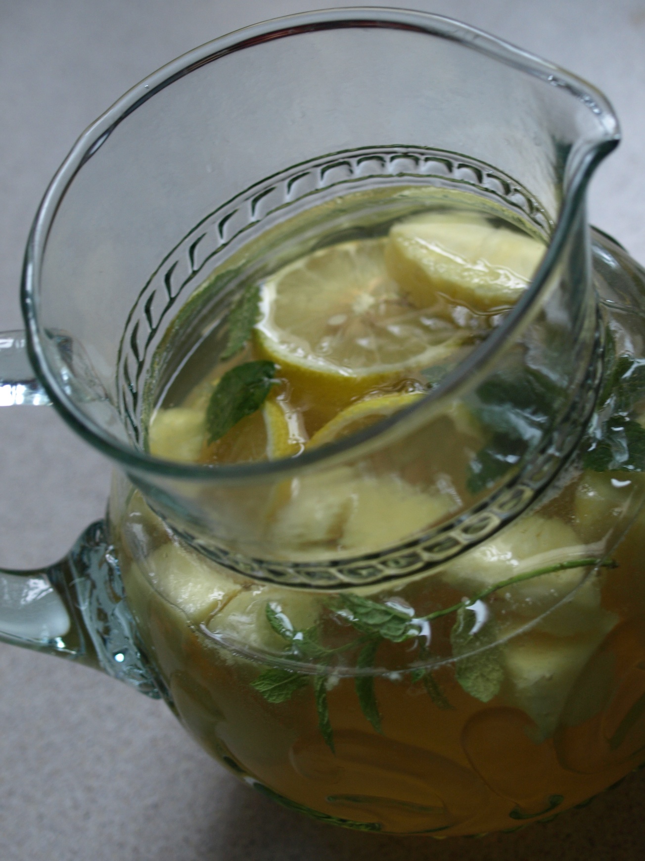 Eine Flasche Riesling, gut gekühlt;etwa 375 ml herbe Zitronenlimonade (umfangreiche Tests haben ergeben, dass Sinalco Zitres gut funktioniert); ein Viertelliter Earl Grey, mit Eis gekühlt, drei Zweige frische Minze (leicht zwischen den Händen rollen), drei Scheiben Zitrone, 2 Scheiben Ananas und Eis.