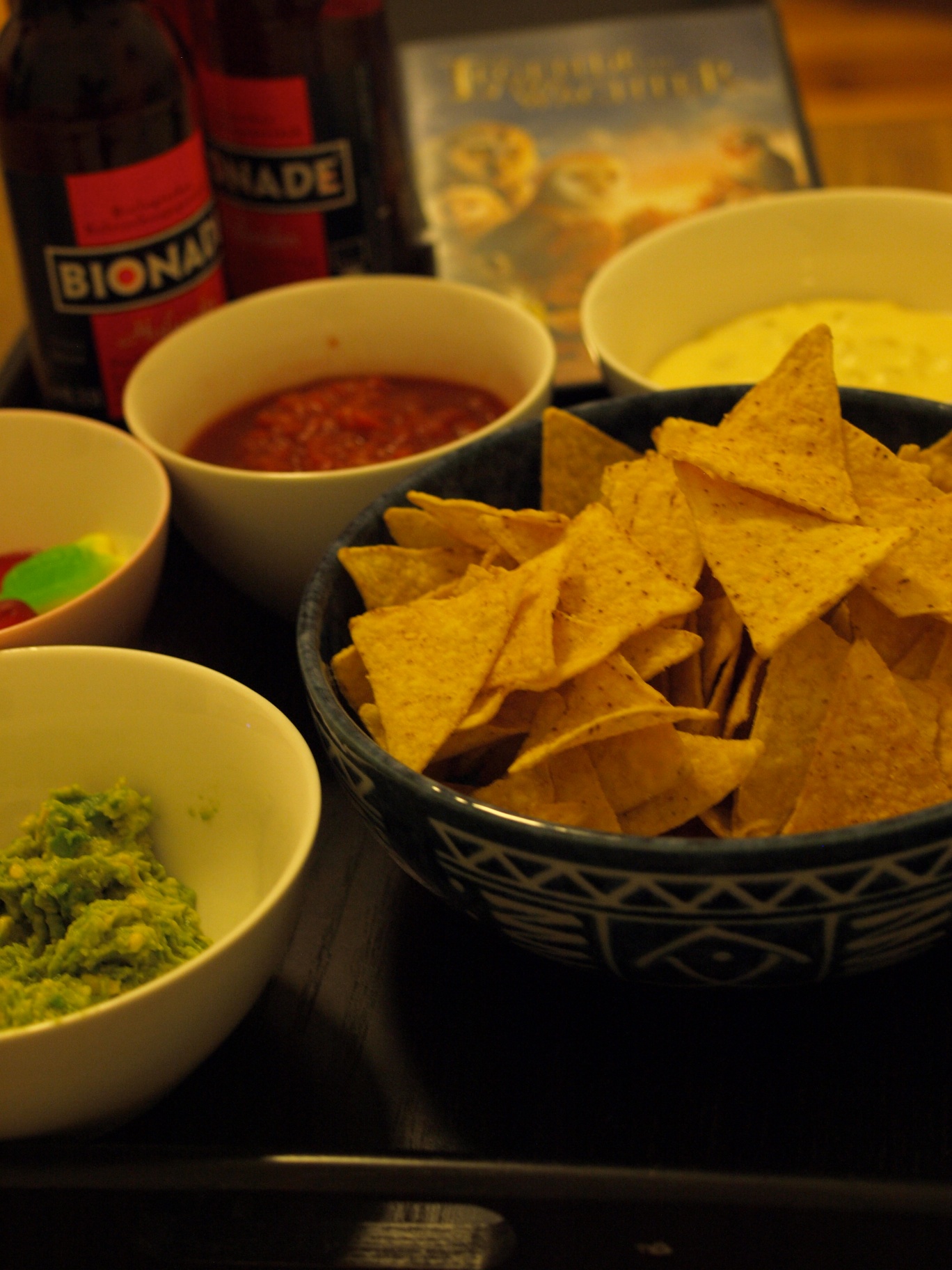 Ferien, es regnet, man würde ja gerne raus, aber es geht nicht. Was tun gegen den drohenden Hüttenkoller? Bei uns zieht da immer das Film-Event auf dem Sofa. Ein Familienmitglied darf den Film aussuchen, der Rest das drumherum. Diesmal gab’s die Legende der Wächter (wer ist bloß auf DIE Idee gekommen?). Dazu Nachos mit drei Soßen: selbstgemachte Käsesauce, eine gekaufte scharfe Sauce und die heissgeliebte zerdrückte Avocado mit Zitrone, Knoblauch, Pfeffer Salz. Für das Kind eine Hand voll sorgfältig ausgewählte Gummitiere, jeder eine Limo und ab geht’s. Das macht sogar bei mittelprächtigen Filmen Spaß. Ins Kino gehen kann ja jeder.