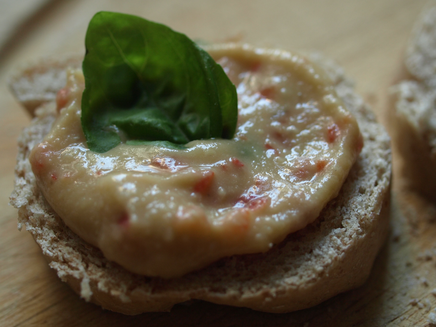 Am Ende habe ich 150 Gramm rote Linsen und zwei halbierte Knoblauchzehen mit Wasser (ca. 400 ml) aufgekocht und dann 20 Minuten köcheln lassen. Nebenher wurde eine halbe rote Paprikaschote mit einer halben Chilischote und ein paar Blättern Basilikom gehackt, so fein ich es eben hinbekam. Nachdem die Linsen abgekühlt waren, wurden sie mit drei Esslöffeln Olivenöl püriert, danach mit dem roten Gemüsehäcksel gemischt und mit Salz, Honig und Zitronensaft abgeschmeckt.