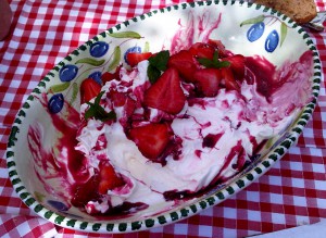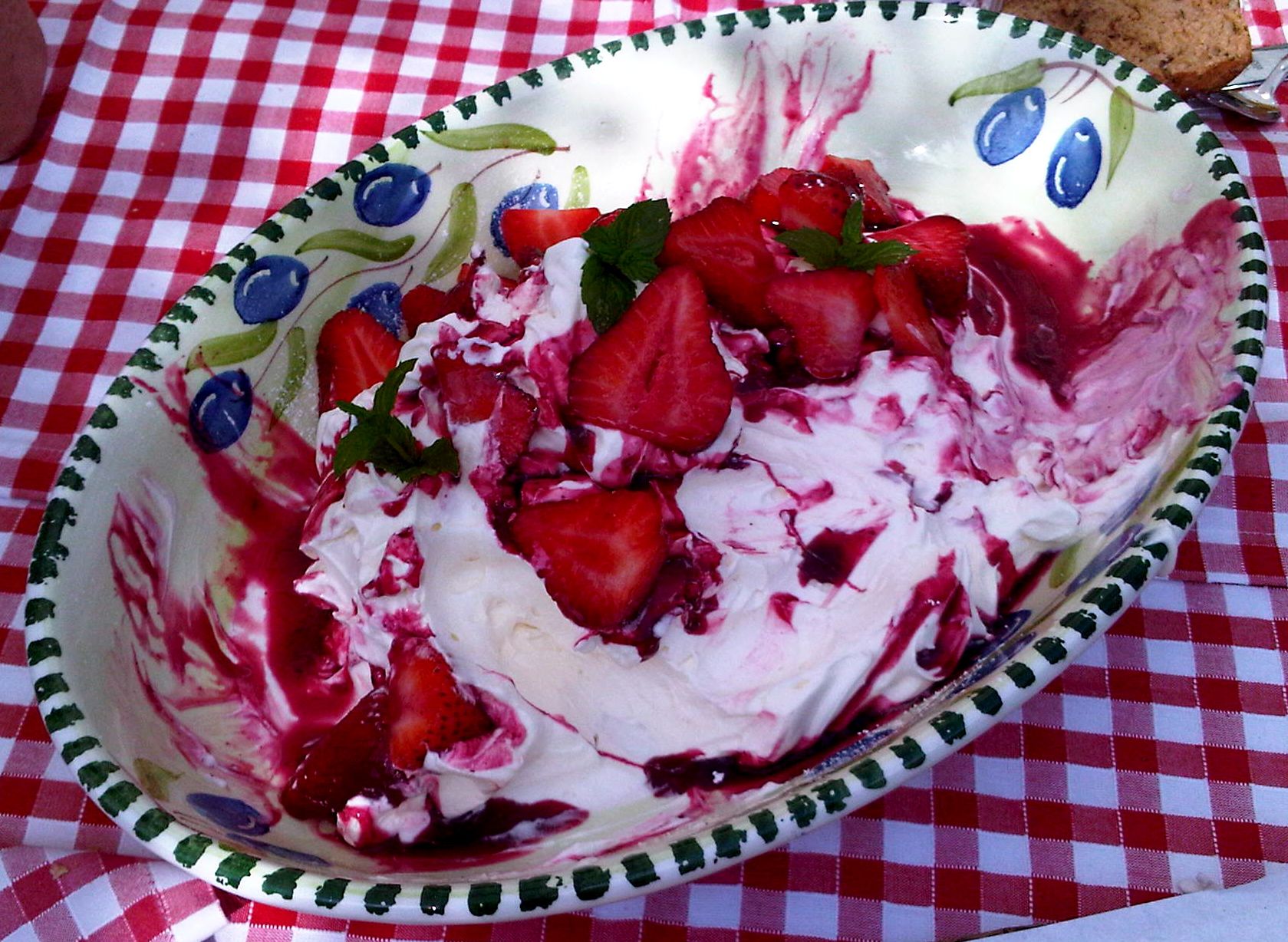 Und so aßen wir geschlagene eineinhalb Stündchen. Und als eigentlich kein Platz mehr war, orderte der Einladende eine „kleine Portion Erdbeeren mit Mascarpone“. Nur so zum Probieren. Das ist das, was wir bekamen – und das Bild wurde nach dem Genuss gemacht.