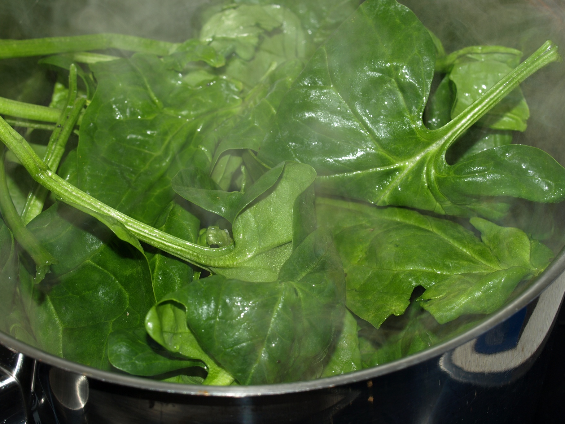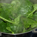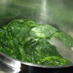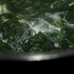 Mit tiefgekühltem Blattspinat funktioniert das zur Not auch, aber frischer ist leckerer. Die Zubereitung ist immer wieder verblüffend, finde ich: man nehme den allergrößten Topf, den man findet und fülle ihn mit tropfnassen Spinatblättern. Und dann kann man auf dem Herd gar nicht so schnell gucken, wie der zusammenfällt: hastenichgesehen, ist nur noch ein bisschen grüner Bodensatz übrig. Da wird schneller Volumen vernichtet als an der Börse. Den leckeren Rest macht man mit der Sahne bekannt, gibt ein bisschen Knoblauch, Pfeffer und Salz dazu (und nach Geschmack Muskat). Käse drüber, fertig. Es ist immer zuwenig Spinat. Aber für eine Popeye-taugliche Menge bräuchte ich einen Waschkessel.