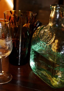 Und so stiegen wir an einem Samstag im Juli die Stufen hinab in die Tiefen der Triobar, den Magen, wie von Mike vorgeschlagen, gut gefüllt und den Wagen sicher zuhause geparkt. Auf der Bar standen nebeneinander gereiht Degustationsgläser, Wassergläser und davor Wasserflaschen, deren Form alleine schon ein Blogeintrag wert wäre.