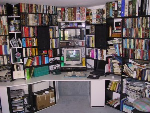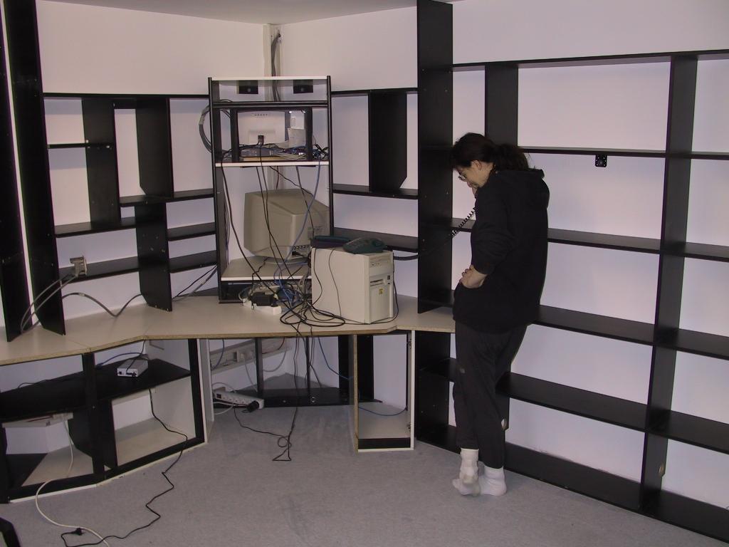 Der Schreibtisch für die Schönste Germanin kam in die linke Seite des Rondells. Mir ist das Licht egal – Leute, Monitore leuchten von selbst – aber sie wollte unbedingt am Fenster sitzen. Zwischen uns, an der rechten Seite des Achtecks, standen Bücherregale und später ein Drucker. Mehr Bücher stehen in Regalen an der rechten und unteren Wand des Rechtecks. Der ganze Aufbau dauerte etwa zwei Wochen intensiver Arbeit und verschlang so ziemlich alle unsere alten schwarz-weißen 80er Jahre Möbel- und Holzreste. Ja, so etwas war mal modern.