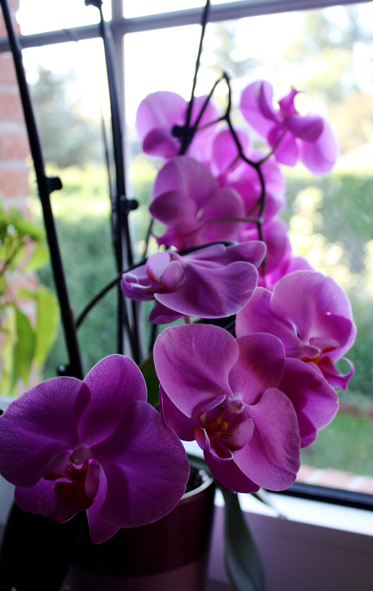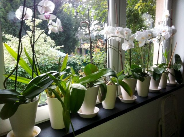 Meine Lieblingsblume/n im Haus sind seit über 10 Jahren die Schmetterlingsorchideen. Mit den Jahren haben sich auch noch 2 andere Arten dazwischengemogelt. Heutzutage sind diese Blumen ja schon sehr gewöhnlich, kein Discounter, der sie nicht zweimal im Jahr für 5 Euro auf den Markt wirft. Für mich sind sie aber immer noch unübertroffen was Anspruchslosigkeit und Blühwilligkeit betrifft. Sollten sie auch, denn viel Fürsorge gibt es bei mir nicht. Alle 5-10 Tage ein Schluck Wasser und alle drei Monate mal die alten Rispen abschneiden.