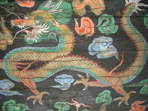 In den folgenden Tagen durften wir erleben, was es heisst, wenn eine quirlige, ewig geschäftige Metropole von 20 Millionen kollektiv in Niedergeschlagenheit verfällt. Dieses bedrückte Stimmung war allgegenwärtig und legte sich für ein paar Tage wie ein Schleier über die Stadt. Die Ruine wurde umgehend eingerüstet und mit der Rekonstruktion begonnen. Noch steht die Verhüllung. Ende 2012 soll das neue Namdaemun fertig sein. Die Bilder sind aus dem April bzw. August 2007. Der grüne Drache war Teil der Deckenbemalung im Tordurchgang.