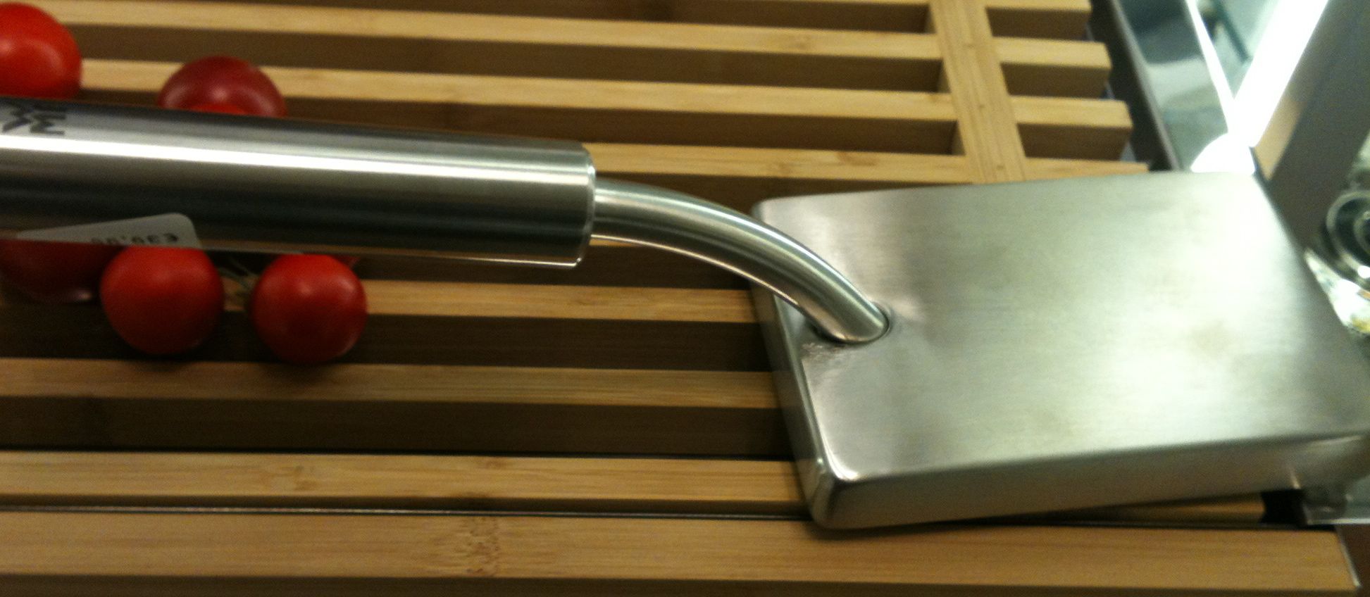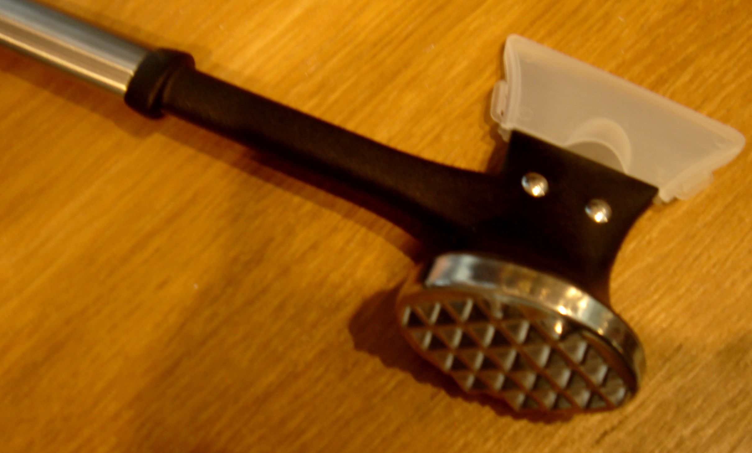 Daraufhin schaute ich mich dann auch hier in der BRD etwas genauer um, ich kauf ja so etwas eher selten. Also eigentlich nur einmal im Leben. Aber dazu später mehr. So handliche Teile gibt es immer noch; ruinieren aber Brett und/oder Fleisch. Wer mal versucht hat, Fleisch damit ohne Löcher dünn zu klopfen, weiß was ich meine.