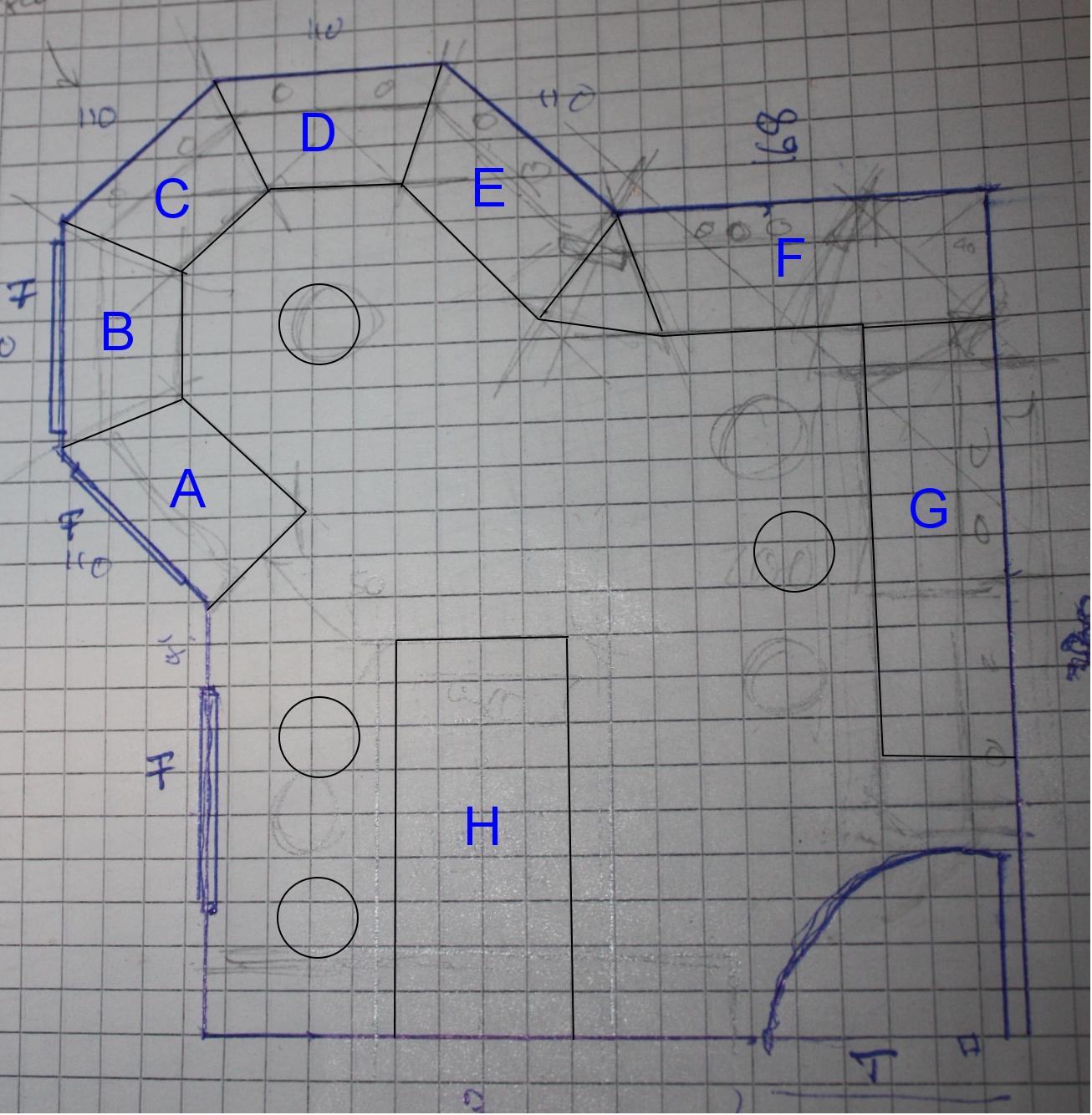 A-E: Der Hauptschreibtisch im Achteck. A und B haben Fenster und sind daher nur begrenzt nutzbar (mein Vorschlag, das Fenster bei B zuzumauern, stieß bei der Schönsten Germanin nicht auf Gegenliebe). Der Hauptsitzplatz wird vermutlich D sein, auch wenn C auf den ersten Blick passender erscheint. Zum Glück müssen wir uns noch nicht entscheiden.