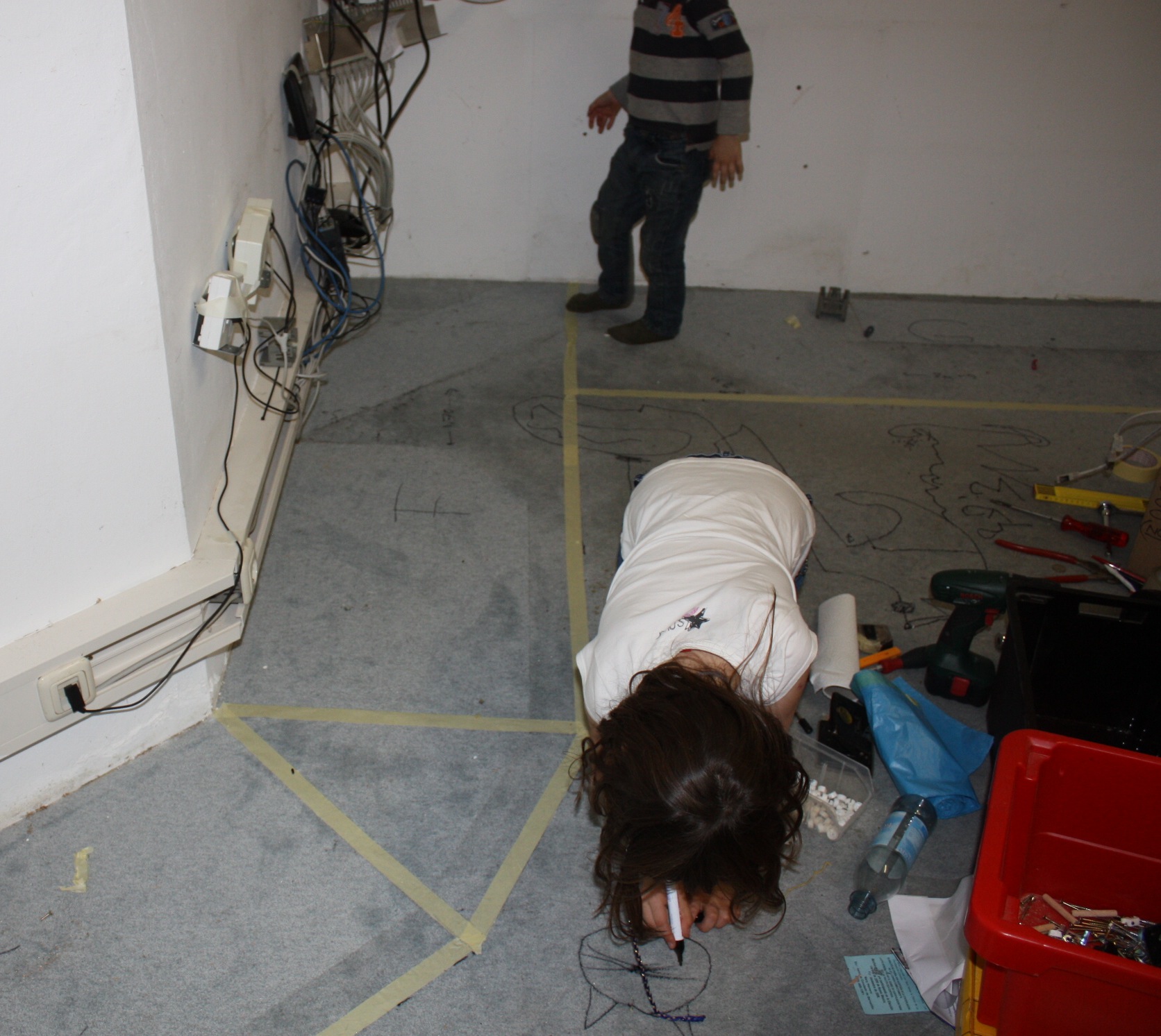 Bevor der Teppich herausgerissen wurde, haben wir den Aufbau mit Klebestreifen auf dem alten Teppich simmuliert. Das war nützlich: Ursprünglich wollte ich den Spieltisch (H) 90 cm breit sein lassen. Beim Testen wurde klar, dass das zu breit ist. Jetzt sind 80 cm geplant. Siedler von Catan passt trotzdem.
