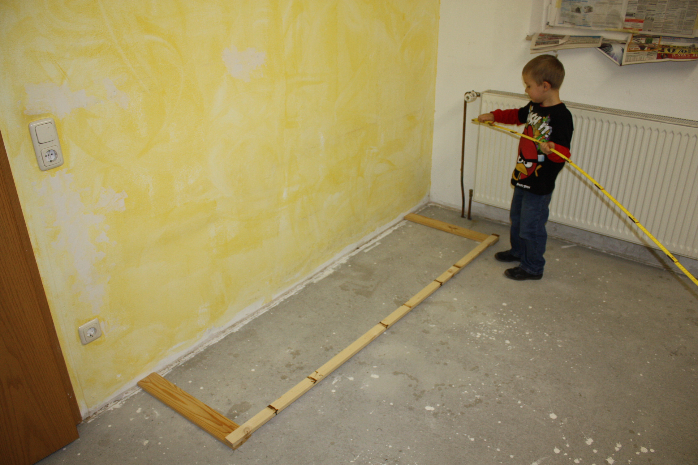 Der Kindercomputertisch steht in dieser Variante an der Wand mit der Tür (H) — Tiefe 60 cm, Breite zwei Meter. Die Lage hat mehrere Vorteile: An der Heizung ist es am wärmsten, es gibt Tageslicht (wenn auch von der falschen Seite, da Kind Nummer Eins Rechtshänder ist), und wenn man am großen Tisch sitzt, kann man über den Kinder-Computer Filme gucken. Je größer der Monitor, desto besser.
