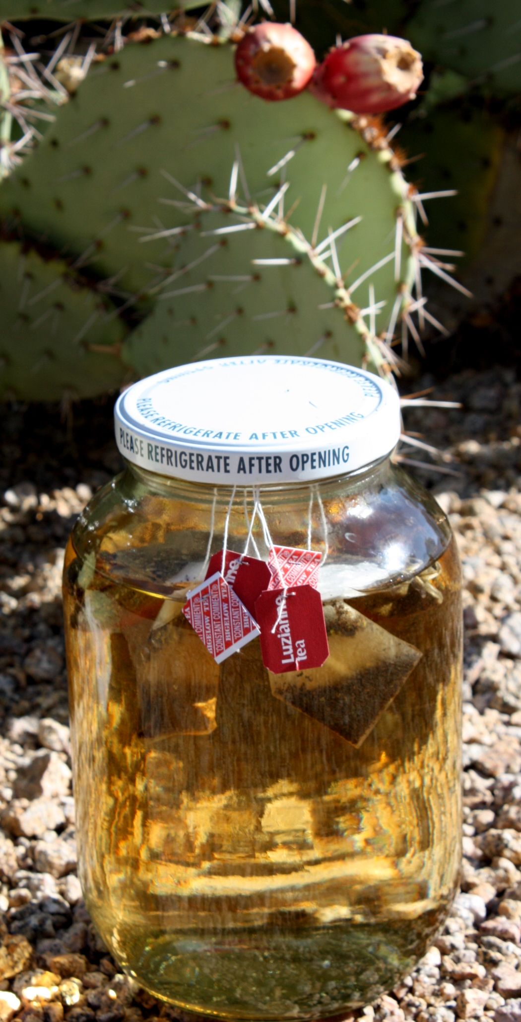 Man nehme also ein sehr grosses, verschließbares Glas und lasse es voll kaltes Wasser laufen – oder zumindest so kalt, wie es im Sommer aus dem Hahn kommt. Dann gebe man hochkonzentrierten Eistee in Beuteln dazu sowie zwei Beutel Tee nach eigenem Geschmack – Chai, Pfefferminz, Kräuter – was immer man gerade mag. Das Glas zuschrauben und etwa 5-6 Stunden in die Sonne gestellt. In die pralle Sonne bitte. Ein Kaktus im Hintergrund muss nicht sein, macht sich aber sehr gut.