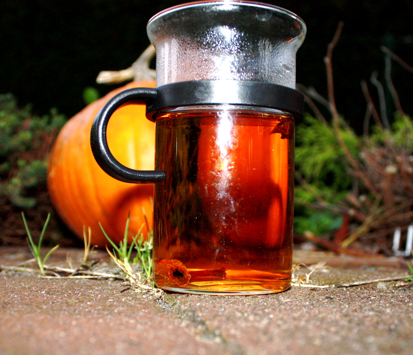 Kakao assoziere ich eher mit Schmuddelwetter, Tee auch. Also machte ich einen Apfelpunsch. Einen Liter mit einer Zimtstange, einem Sternanis und drei Nelken erhitzen. Fertig. Wirklich sehr, sehr lecker und schmeckt vor allem im frühen Sonnenuntergang.