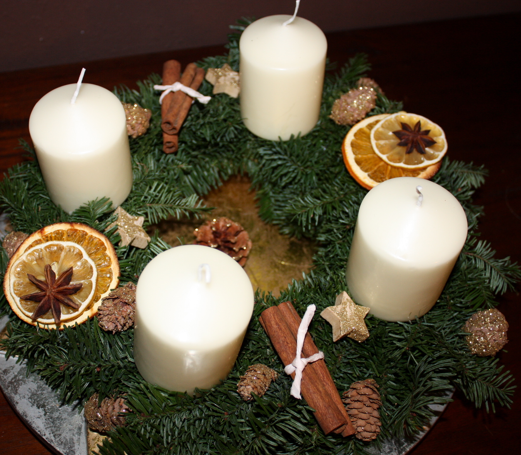 Im Moment haben es mir natürliche Materialien angetan. Wenn man sich aber anschaut, wie teuer getrocknete Orangenscheiben im Bastelbedarf, Blumen- oder auch nur Baumarkt sind, dann treibt es einem die Tränen in die Augen. Also eine Zitrone und eine Orange in Scheiben geschnitten und 3 Stunden bei 50 Grad und Umluft aufs Gitter gelegt. Dazu beim Metzger in der Gewürz-Ecke Zimt und Sternanis gekauft. Das Ganze wurde dann auf einen zugegebnermaßen fertig gekauften Kranz mittels Kleber zusammen mit der aufgehobenen Deko vom letztem Mal gebracht und schon ist der Kranz fertig. Und nein, er ist immer noch nicht angezündet, einfach, weil das Wochenende so derart voll war, dass es schlicht keine Muße gab. Aber das werden wir heute nachmittag nachholen.