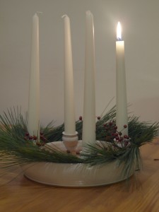 Kommen wir nun eine Stufe höher im Purismus. Simone hat diesen wunderbaren, schlichten weissen, jedes Jahr wiederverwendbaren Porzellankranz. Da wird dann Kiefer reindeokiert und in der dritten Inkarnation die Beeren vom Herbststrauß reindrapiert. Weiße lange Kerzen rein – fertig. Das Schöne an diesem Kranz finde ich ja, dass er sich fein zurücknimmt und er auf dem Küchentisch wie auf dem Wohnzimmertisch wie auch auf dem Schreibtisch gut aussieht. Und zierlich genug ist er auch, man kann ihn gut von A nach B tragen, ohne daß man gleich den halben Schwarzwald in der Wohnung verliert.