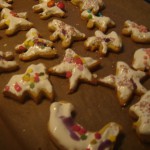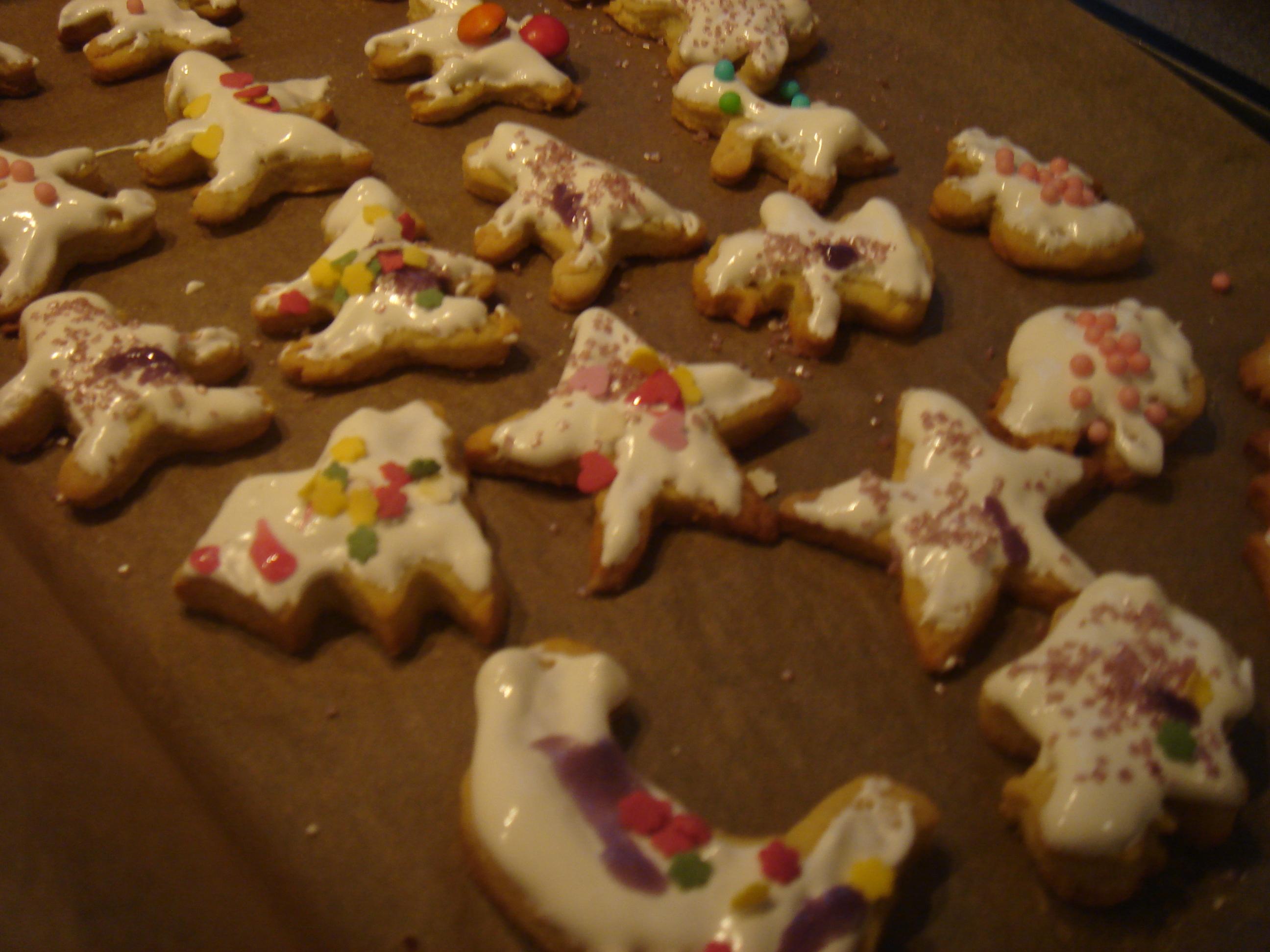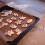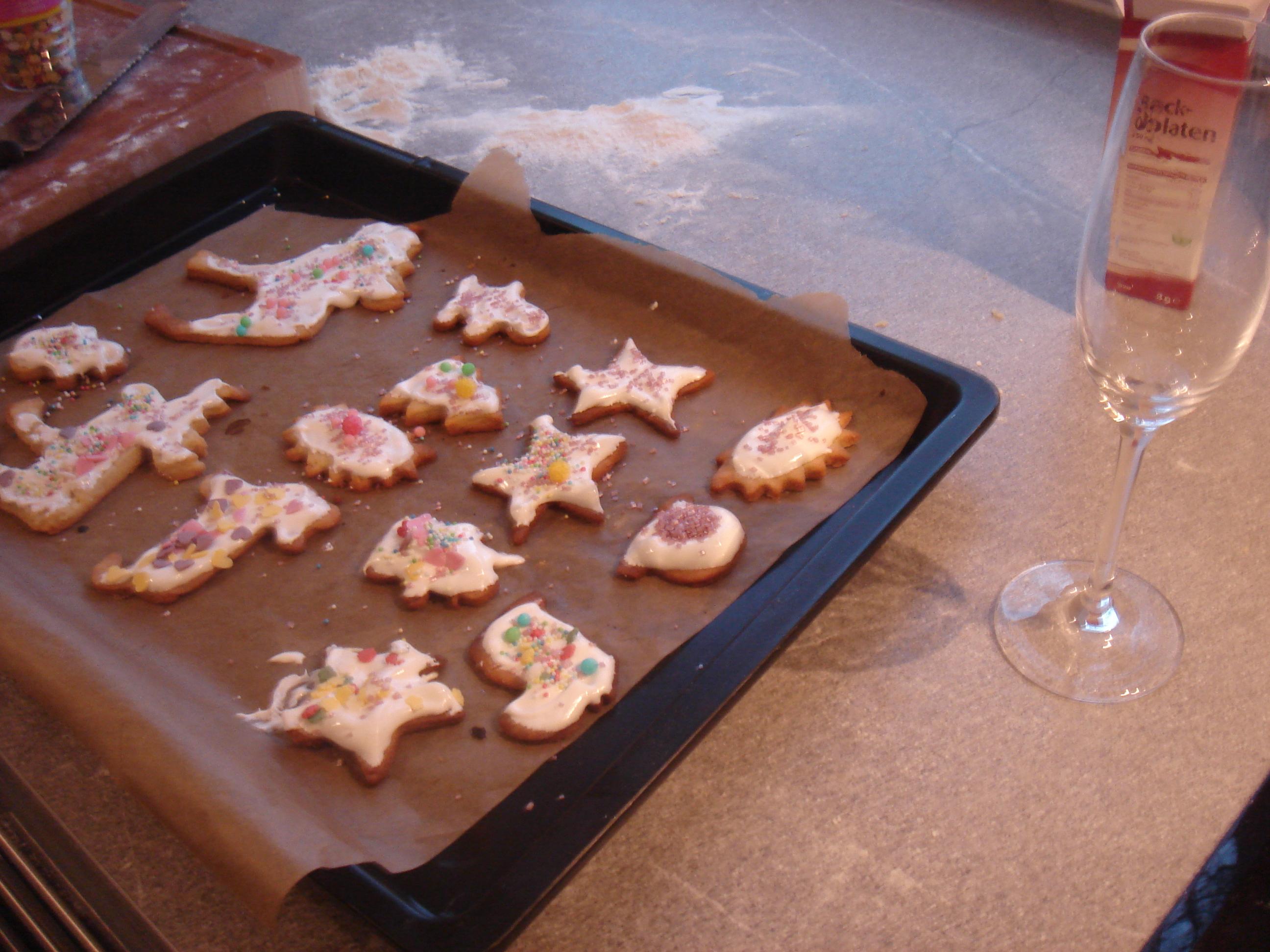 Natürlich mußten wollten wir mit dem Kind wie jedes Jahr auch an einem der arbeitsfreien Adventsonntage Plätzchen backen. Wir haben noch ein anderes Kind mit Mutter eingeladen und ein paar schöne Rezepte aus der e&t rausgesucht. Da finden sich immer sehr schöne Sachen die man im Unterschied zu irgendwelchen Internetforen auch bedenkenlos nachbacken kann. Und die Küchenbrause darf natürlich auch nicht fehlen.