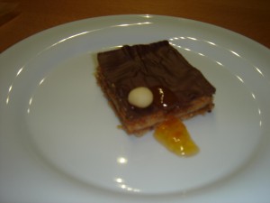 Ich wollte für uns nämlich ein paar Dominosteine nach einem Rezept aus so einem obskuren Forum backen und es war eine Katastrophe. Der Teig ging überhaupt nicht auf. Also habe ich auf die Lebensweisheit von Generationen von Küchenchefs zurückgegriffen und es als Kreation verkauft. Ich hab auch die „kakaohaltige Glasur“ durch eine Mischung bitterer und Vollmilch-Kuvertüre ersetzt. Ob man dann Callebaut oder Valhrona nimmt, macht es nicht mehr aus.