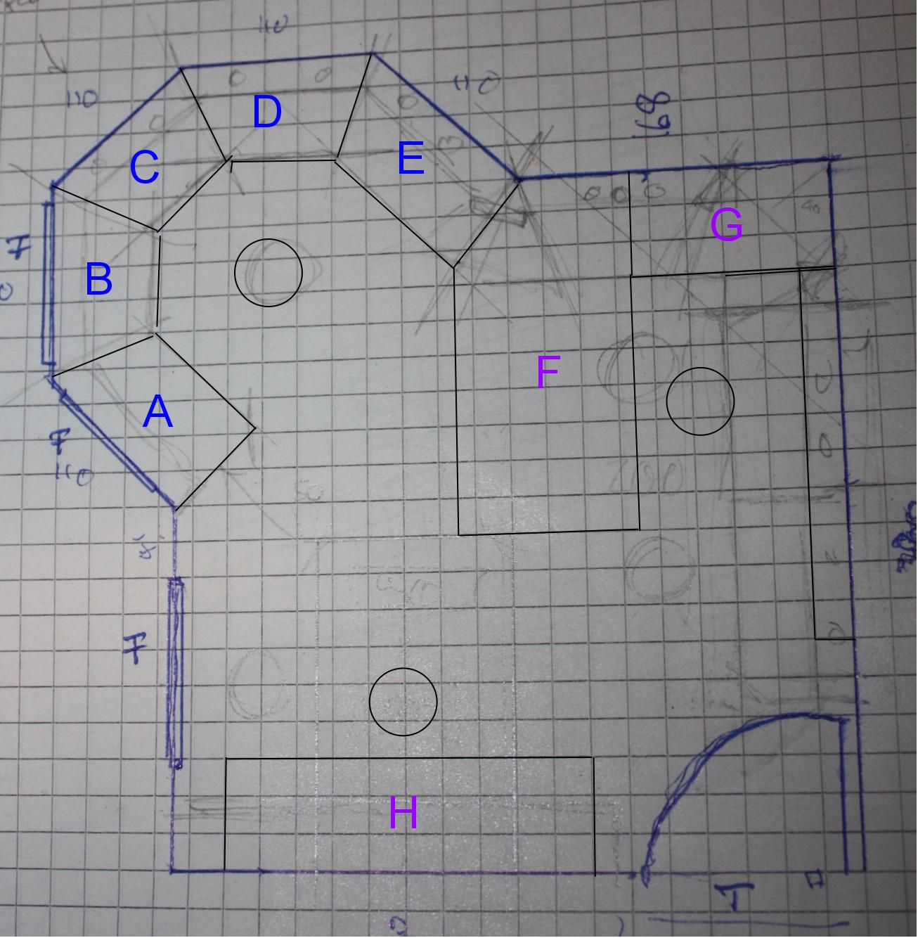 Schauen wir uns noch einmal die Skizze des Zimmers an: Heute geht es um die Tische A-E, die zusammen den World Domination Table ausmachen, den Rundum-Tisch, von dem aus ich die Unterjochung der Welt planen werde, sobald mein Mitgliedsantrag für die Evil League of Evil angenommen wird.