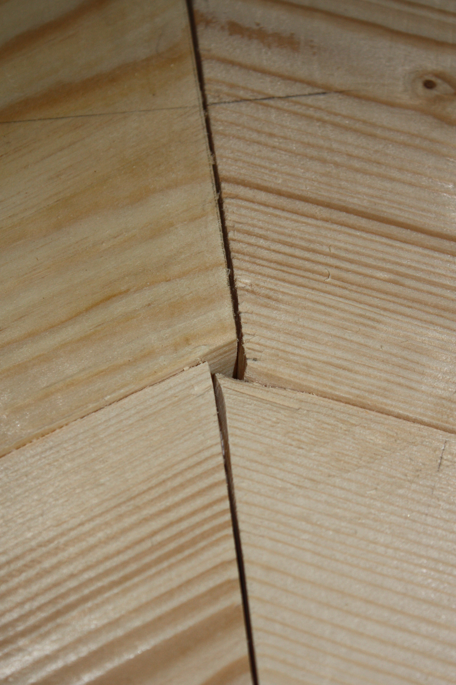 Am Ende entspricht das Ergebnis zwar dem Gesamtziel. Aber nur, weil alles mit dem Elektrohobel und der Schleifmaschine ausgeglichen werden kann. Die Fugen werden wir mit Holzspänen und einem Sägemehl-Klebstoff-Gemisch verschließen (wozu es einen eigenen Eintrag geben wird). Auch die Löcher für die Kabel in den Ecken der Achtecke sind groß genug.