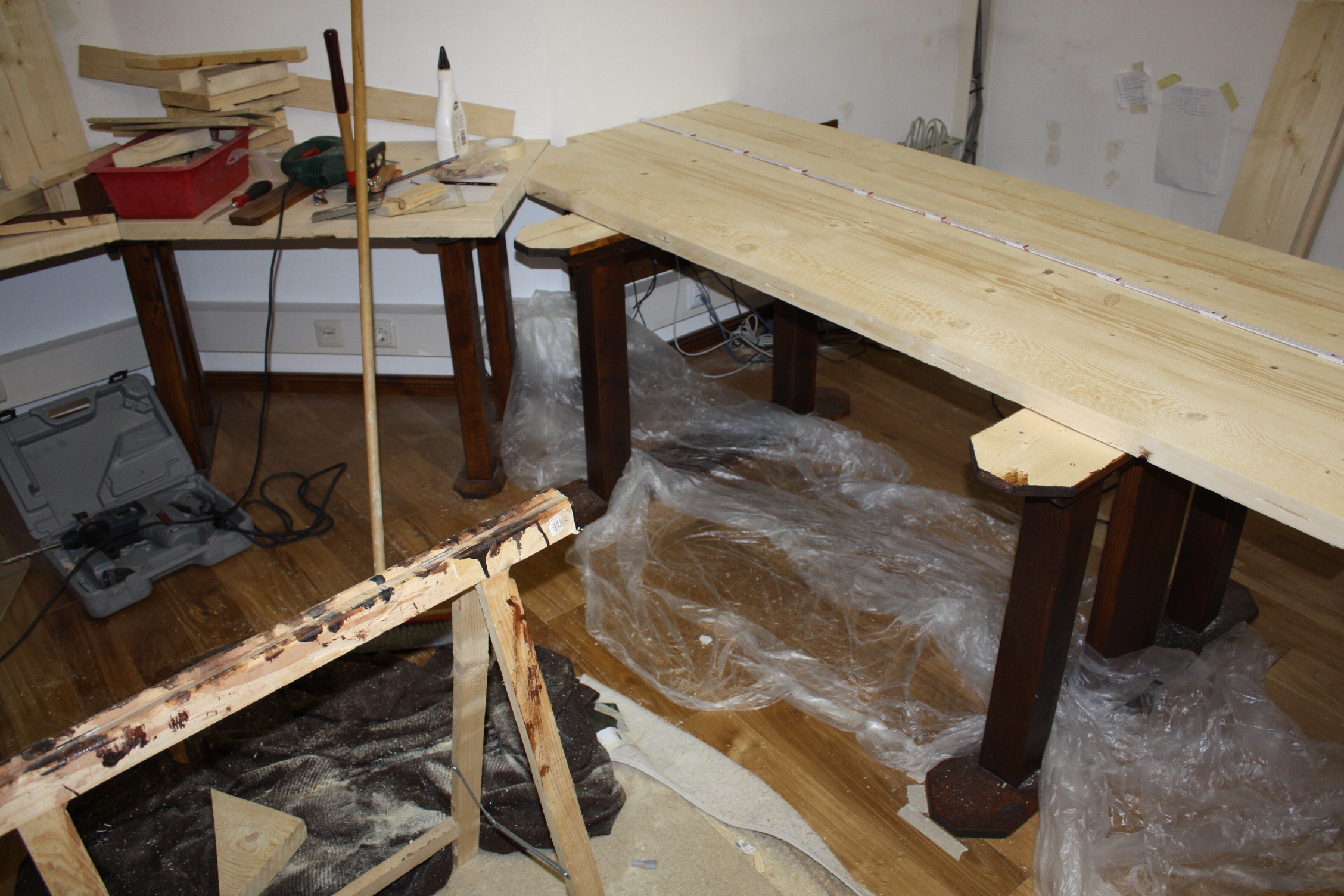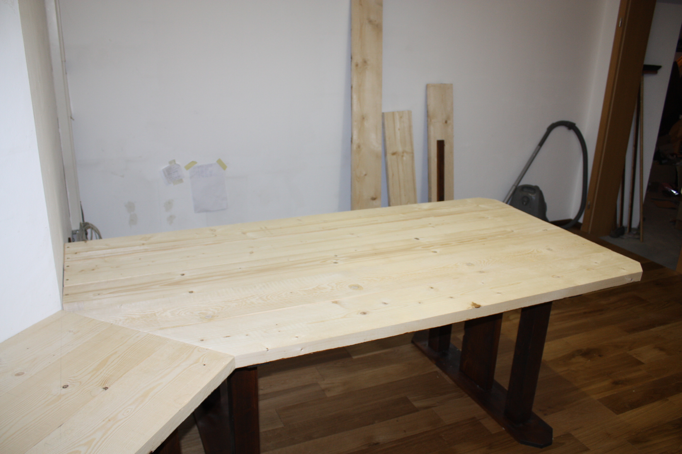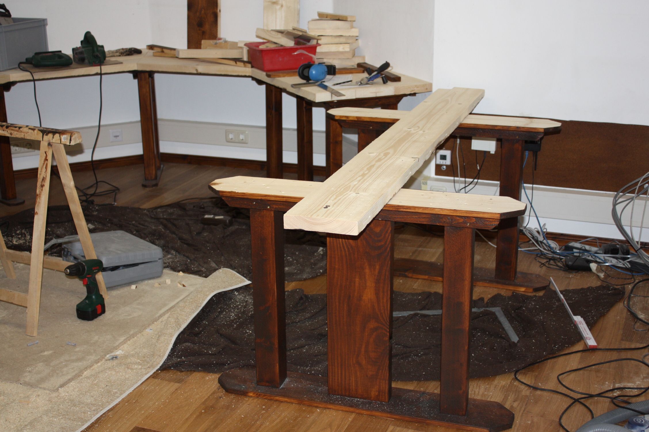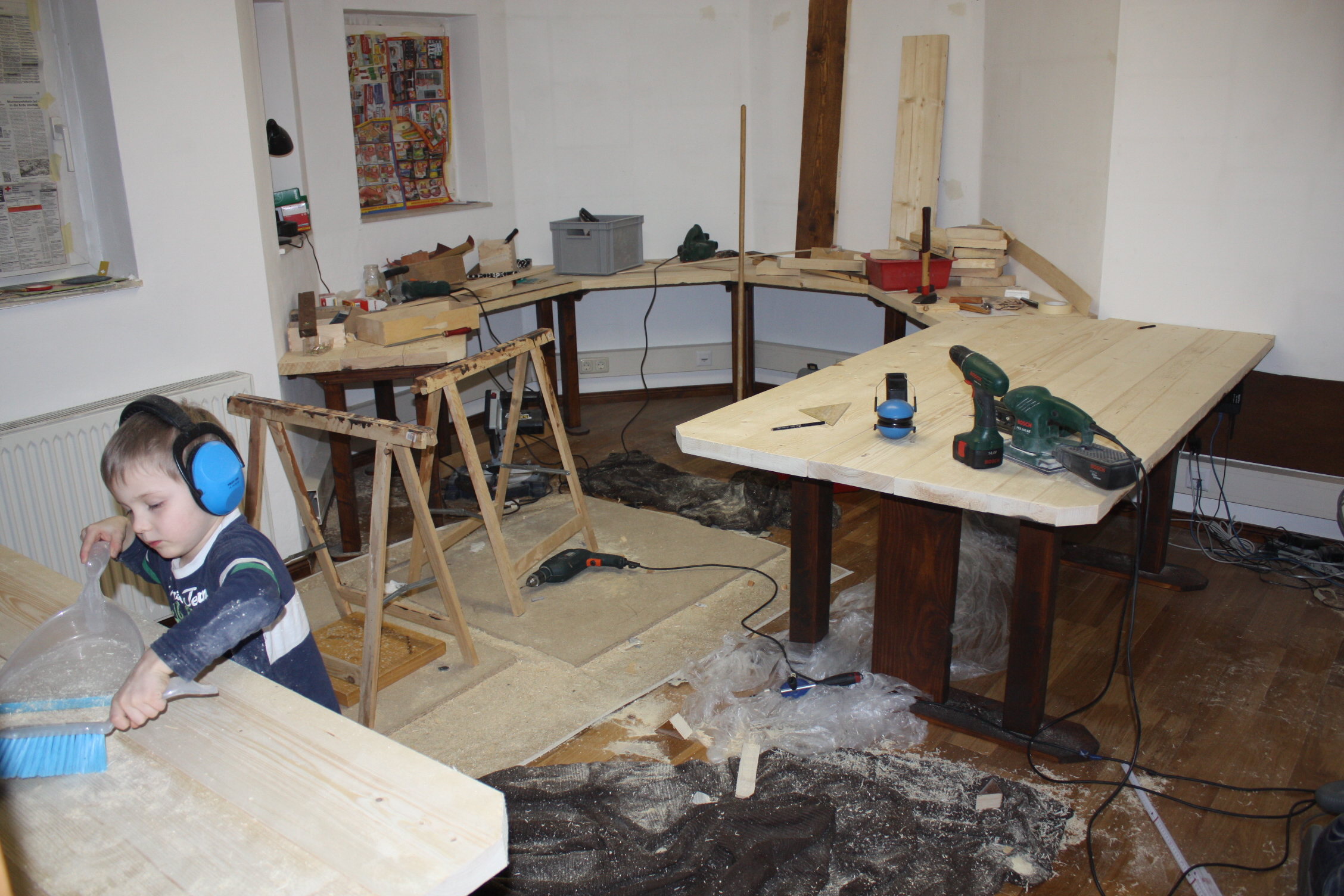 Am Kindertisch läuft das Verfahren genauso, wenn auch nur mit drei Brettern und ohne Winkelschnitt. Einen Tisch haben wir jetzt noch, den „Utility Table“ rechts vom SGT. Und dann geht es darum, die Oberflächen aller Tische zu glätten — wieder was für den Wolf.
