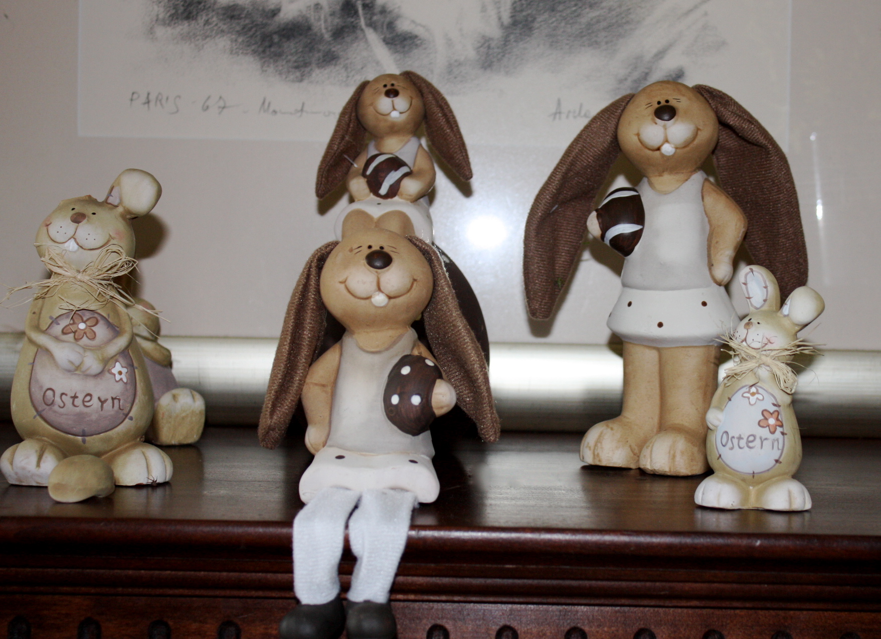 Also besteht meine Deko in der hauptsache aus frischerstandenen Häschen aus dem Baumarkt, die schon reduziert waren – wobei das Ei vor dem einen Hasen kein Ei sondern ein Ohr ist, das leider den Transport nicht auf seinem Platz überlebt hat.