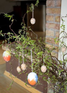 Ansonsten besteht meine Osterdeko hauptsächlich aus Apfelbaum-, Forsytien- und Korkenzieherweidenästen aus dem Garten. Mit selbstbemalten Eiern meines Sohnes an den Ausläufern. Wobei auch eher eine Tendenz zum eher ungrellen hat. GöttinseiDank.