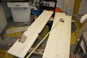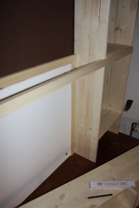 Eigentlich könnten wir es uns mit den Regalen über den Kinderschreibtisch einfach machen: Rechts und links von der Pinnwand kommen „Regalsäulen“ und darüber als drittes Modul Querregale. Und fertig. Grob machen wir das auch so, probieren dabei aber etwas neues aus: eine „japanische“ Querstütze durch Latten unter der untersten Querreihe, eingelassen in die senkrechten Bretter. Das erhöht vielleicht die Stabilität und ist vor allem mal etwas anderes.