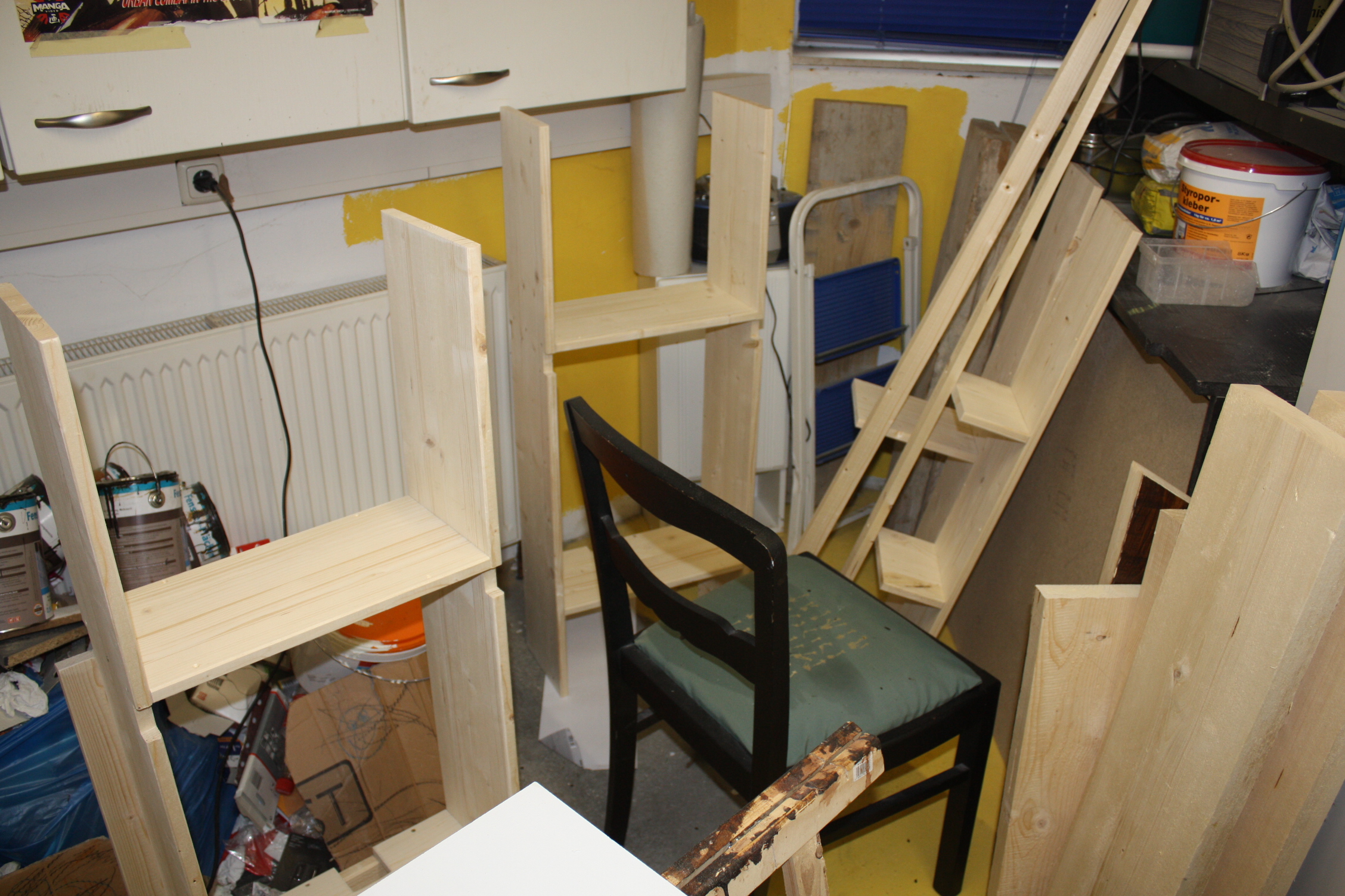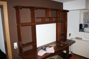 Wir kommen diesmal mit besonders wenig Holz aus: Rechts und links in die Regalsäulen kommen Lautsprecher, meine alten aus Schülertagen, angeschlossen an den alten Verstärker, der vermutlich mehr Strom zieht als alle Computer in dem Zimmer zusammen. Die Querbalken und Latten sind alle zwei Meter lang, müssen also nicht zugeschnitten werden. Oben lassen wir wieder Platz für Aktenordner. Unfassbar, wie viele wir davon haben. Das kann nicht normal sein.