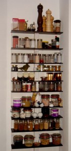 Da wir ja ab und zu etwas bauen, hatten wir auch noch ein Brett übrig, eine leiste findet sich immer. Die Schrauben waren wohl wieder mal teurer als der Rest. Der ursprüngliche Plan, die Möbelplatten freischwebend in einen Balken zu setzen, erwies sich als unhandlich, da so ein Gewürztütchen nur 2 Millimeter braucht, um durchzurutschen.