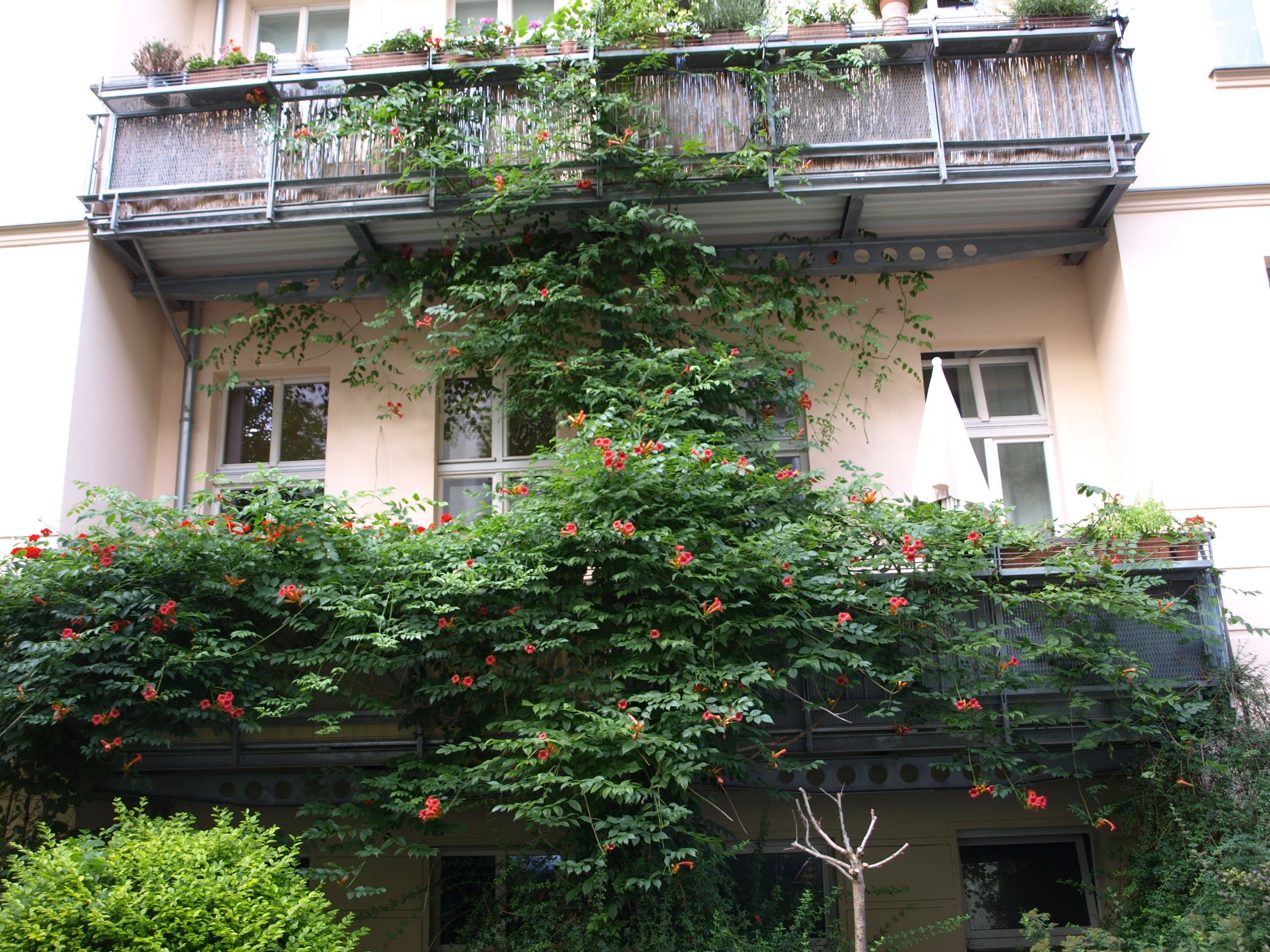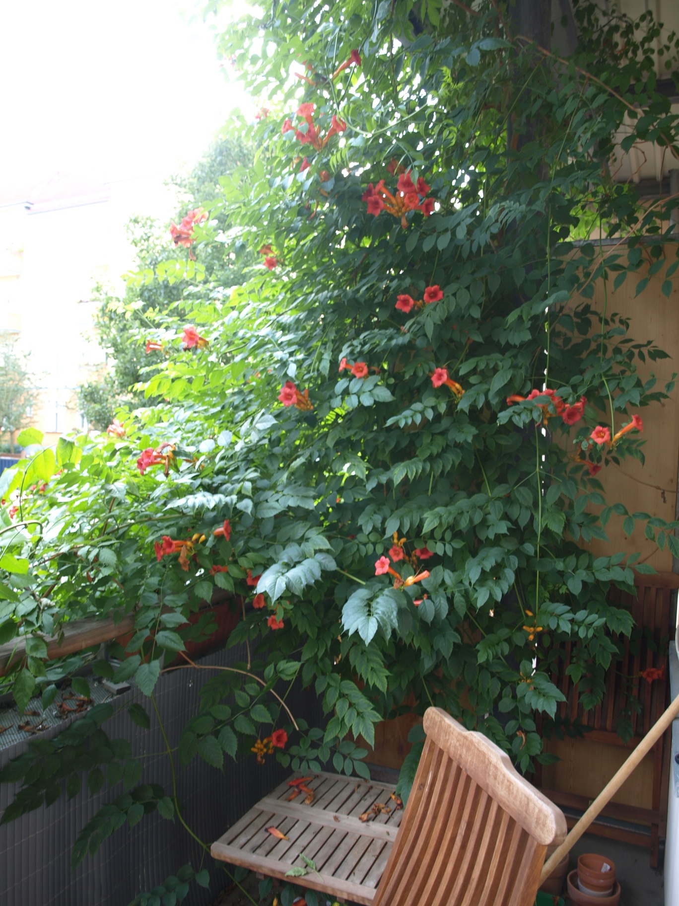 Ich liebe ja die Klettertrompete „Madame Galen“, die unser Gärtner-Nachbar unten im Vorgarten angesiedelt hat und die sich von da aus mühelos die Balkone im übermannshohen Hochpaterre erobert hat.
