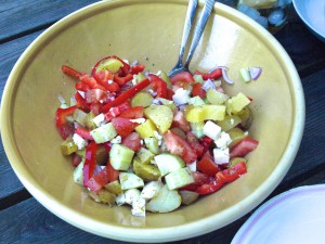 Kartoffeln aufsetzen und anfangen, Gurke, Paprika, Zwiebeln, Oliven, Feta und Tomaten zu schnippeln. Kleine Kartoffeln nehmen, dann sind die gar, wenn man mit dem Rest fertig ist (ja, Holger hat dazwischen noch genug Zeit, den Nachtisch zu backen oder das Gewürzregal aufzuräumen). Und Kates Tipp mit der wirklich große Schüssel sollte man beherzigen, ich habe das Endvolumen beim ersten Mal auch unterschätzt und musste umfüllen.