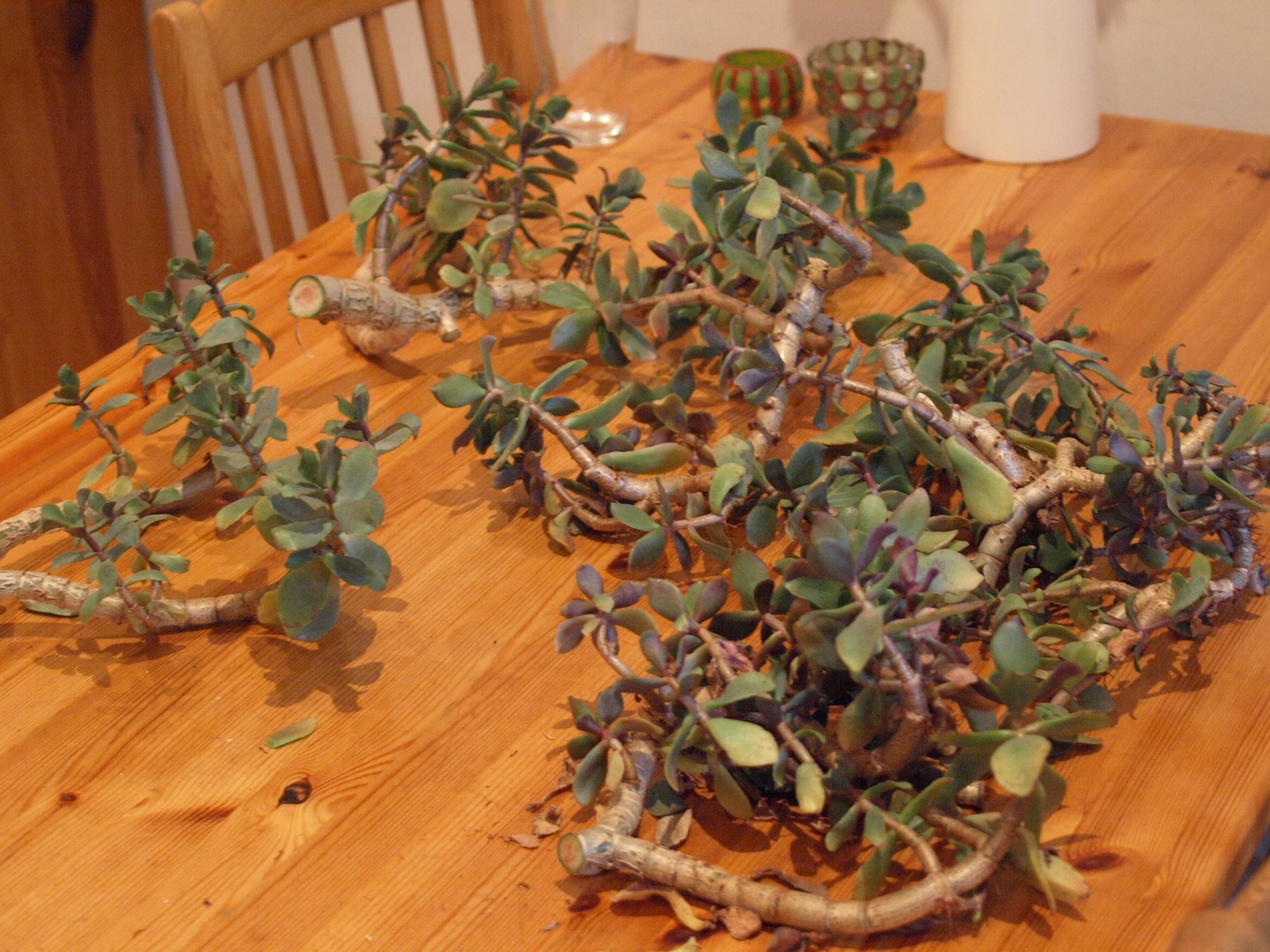 Also im Netz gesucht, was ich falsch mache, und stellte fest: Der Geldbaum mag es hell und trocken. Nicht viel gießen, sparsam düngen. Und eigentlich sehen Geldbäume gar nicht so „durchwachsen“ aus wie unserer. Die sollten eher nach oben wachsen, als in die Breite wie unsere Hecke. Wenn da so ein Durcheinander passiert, dann liegt das an einer zu hohen Temperatur im Winter. Alles, was nach unten und nach innen wächst, scheint schon ein Fehler zu sein. Könne man abschneiden, die Pflanze treibt dann wieder aus. Schuldenschnitt auf dem Fensterbrett. Und immer schön im Auge behalten, auf welche Form man eigentlich hinaus will.